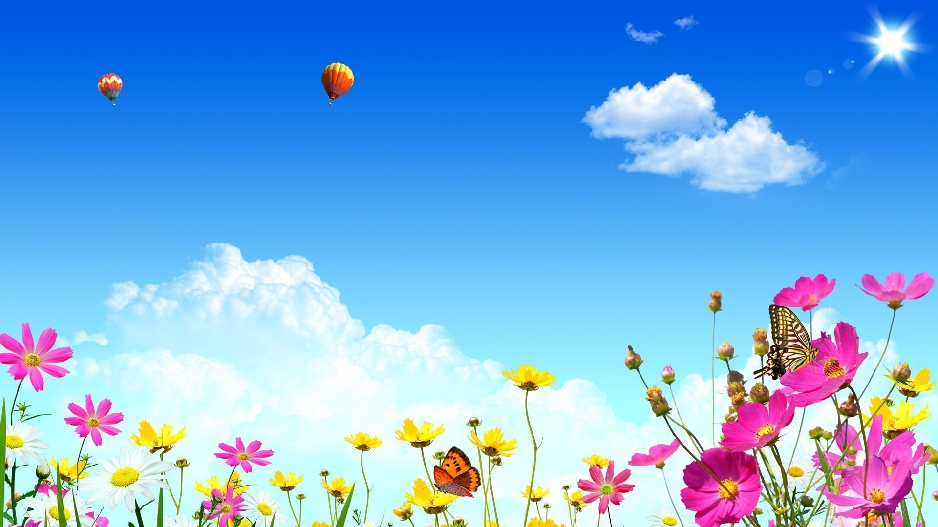 Radura floreale con fiori luminosi e cielo blu con palloncini