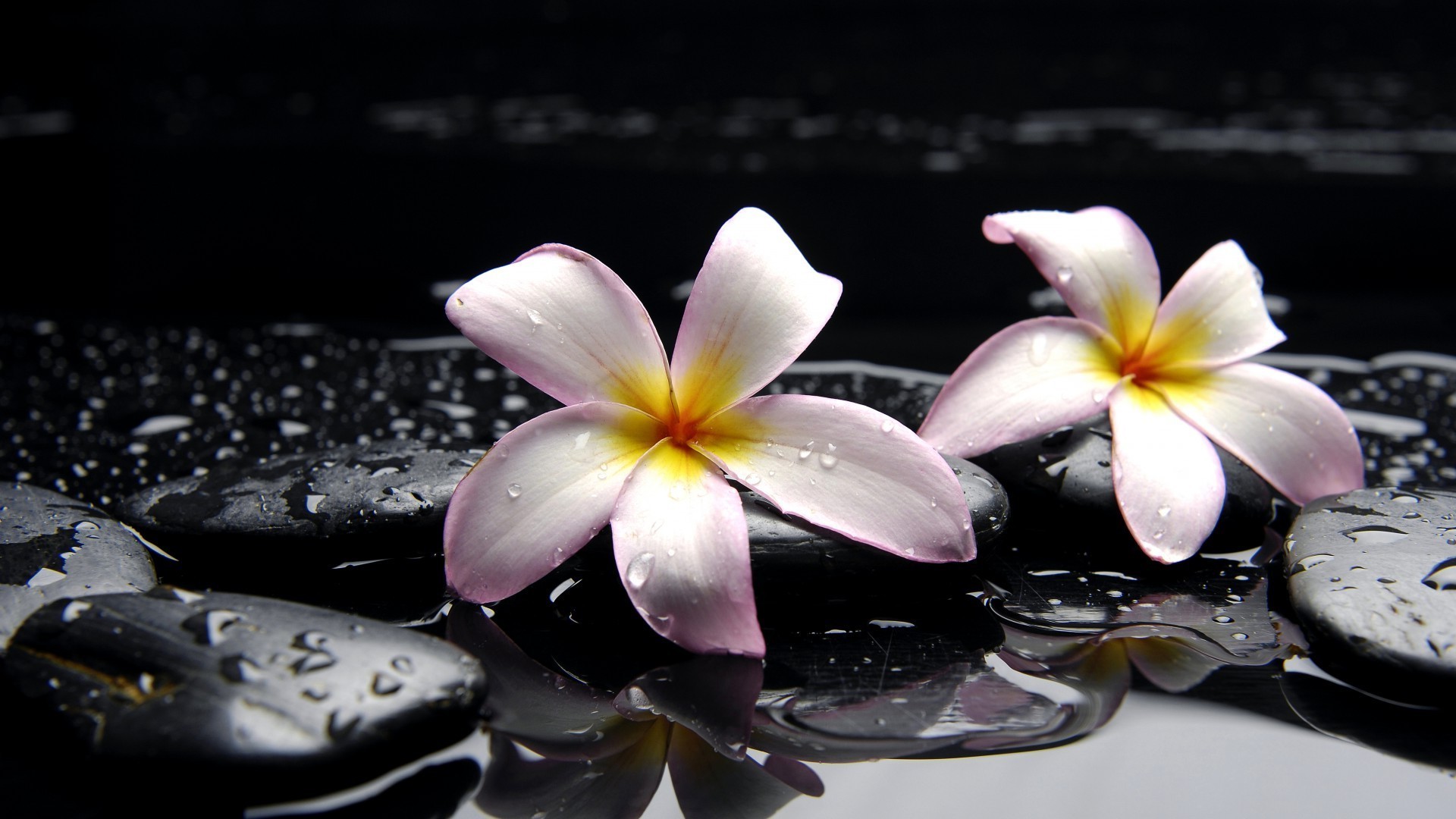 Immagine di due delicati fiori freschi su una superficie bagnata