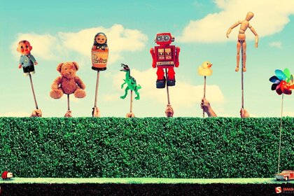 Giocattoli diversi su bastoni sopra la recinzione