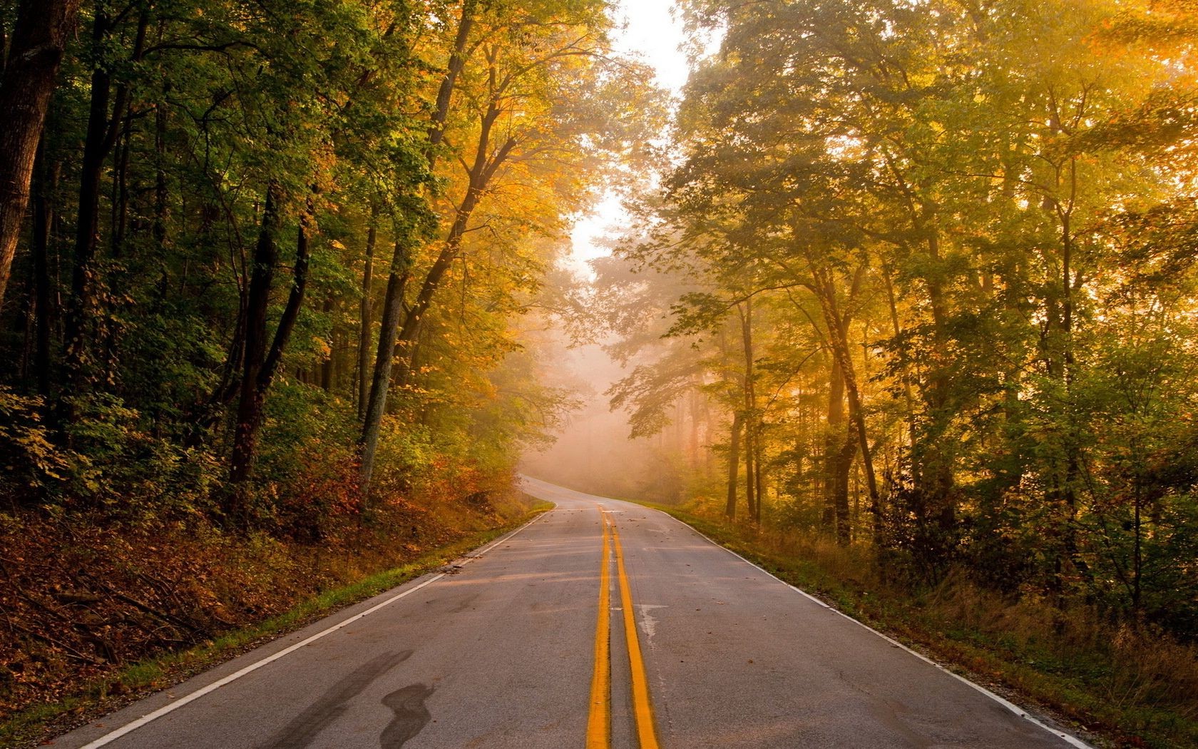 Luce alla fine della strada nella foresta d'autunnoLuce alla fine della strada nella foresta d'autunno
