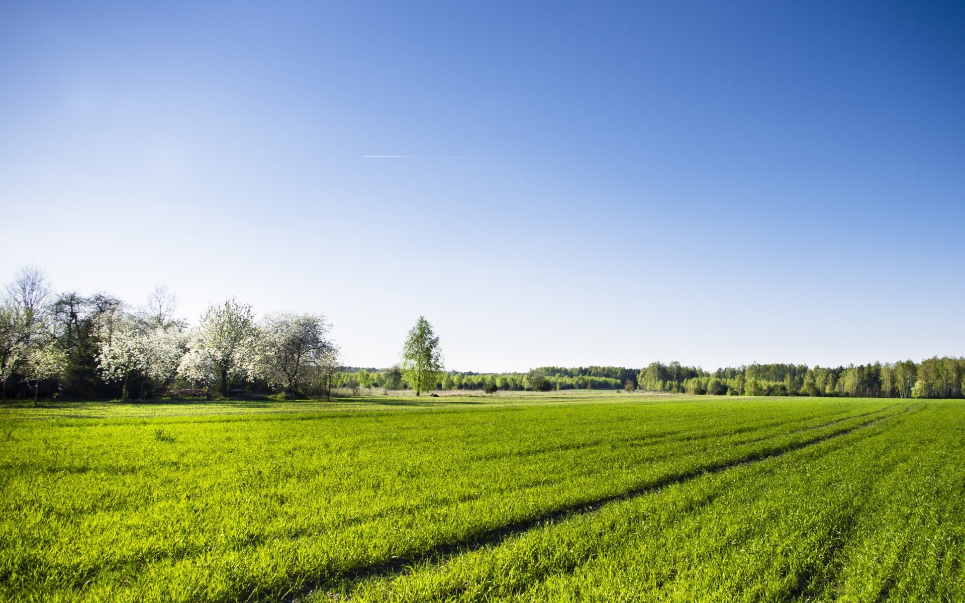 Paesaggio tramonto sullo sfondo di campi verdi e montagne