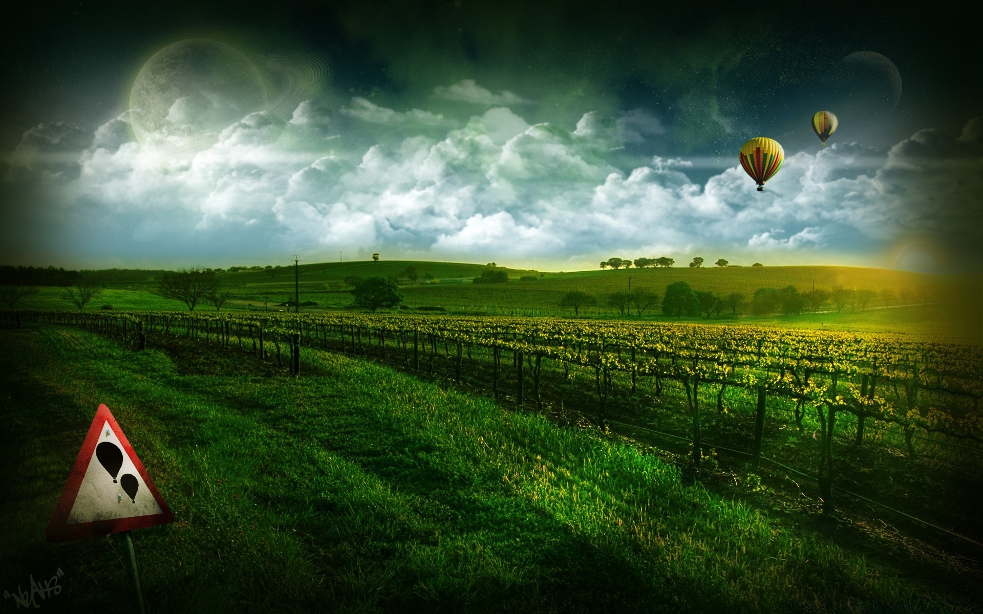 Due palloncini in mezzo a campi verdi