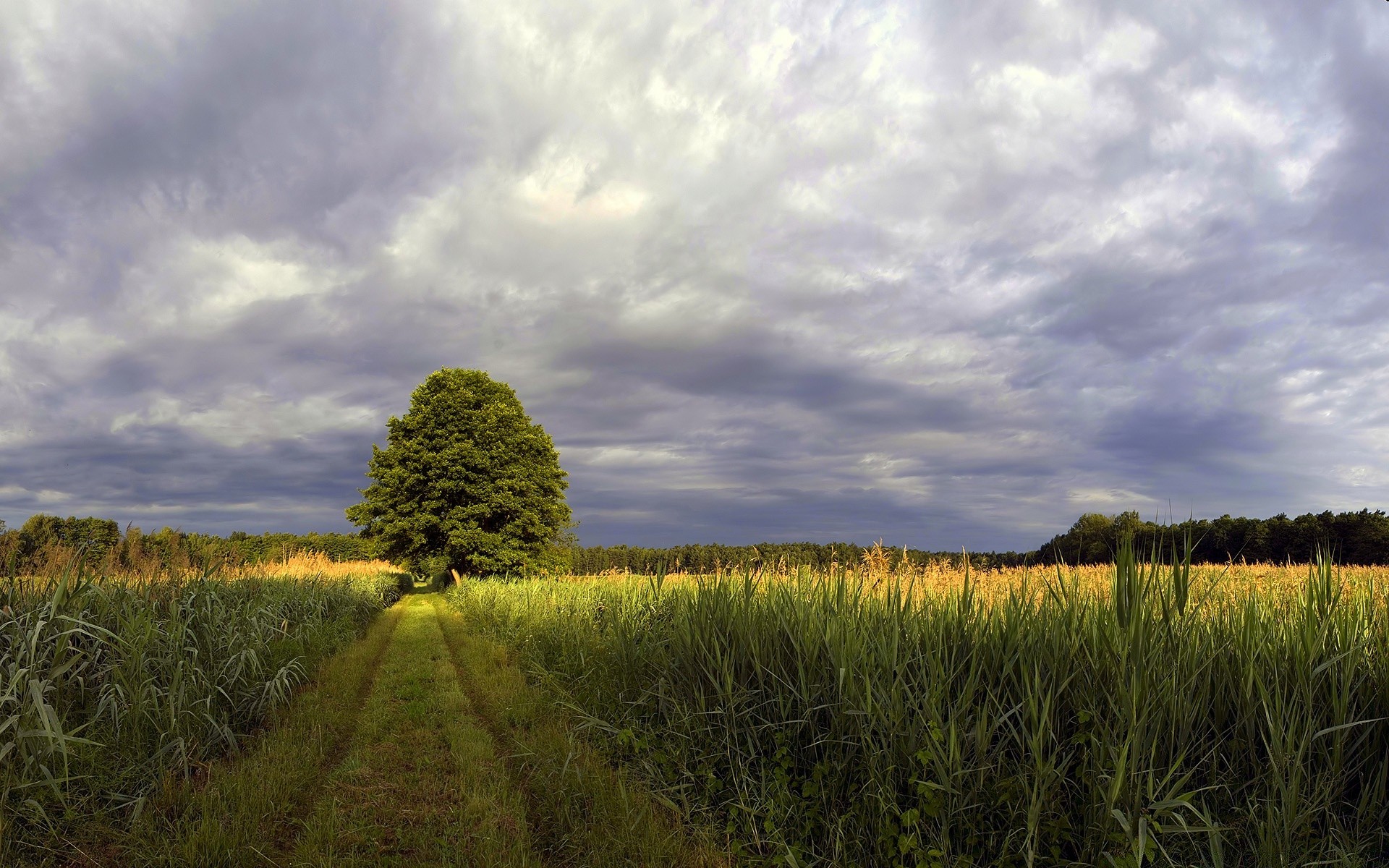 Cielo nuvoloso campo e al centro dell'albero