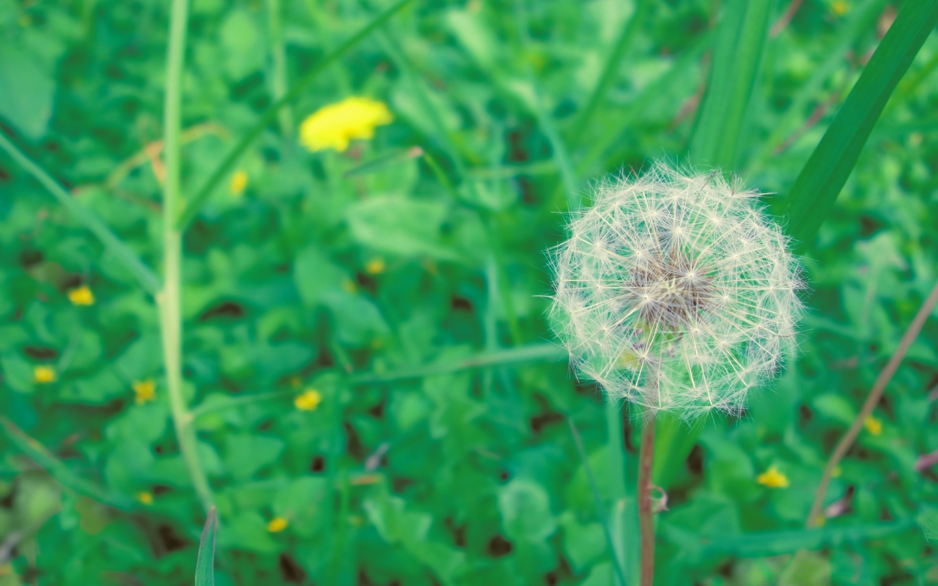 Erba verde e piccoli fiori gialli nel campo sotto i raggi del sole
