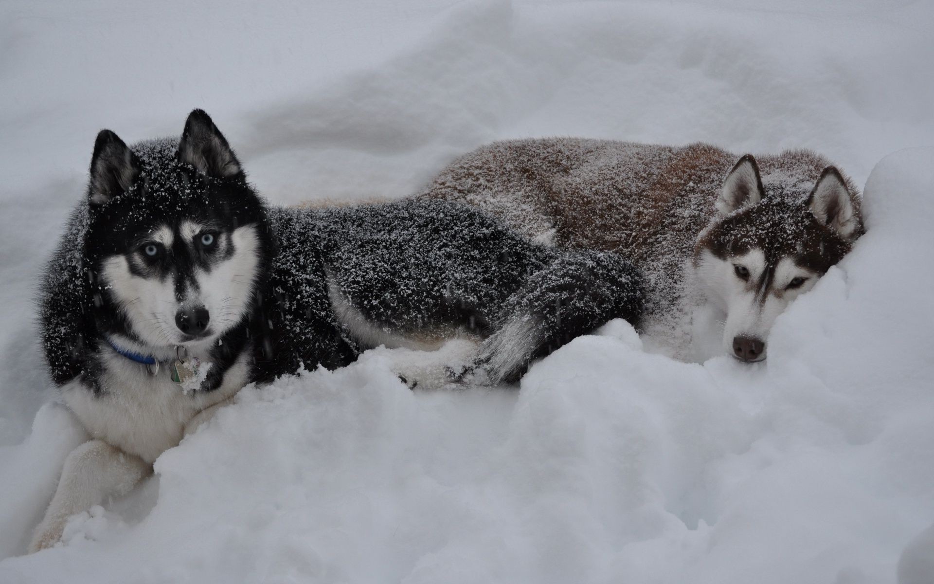 Due Husky purosangue che tirano fuori le loro lingue rosa