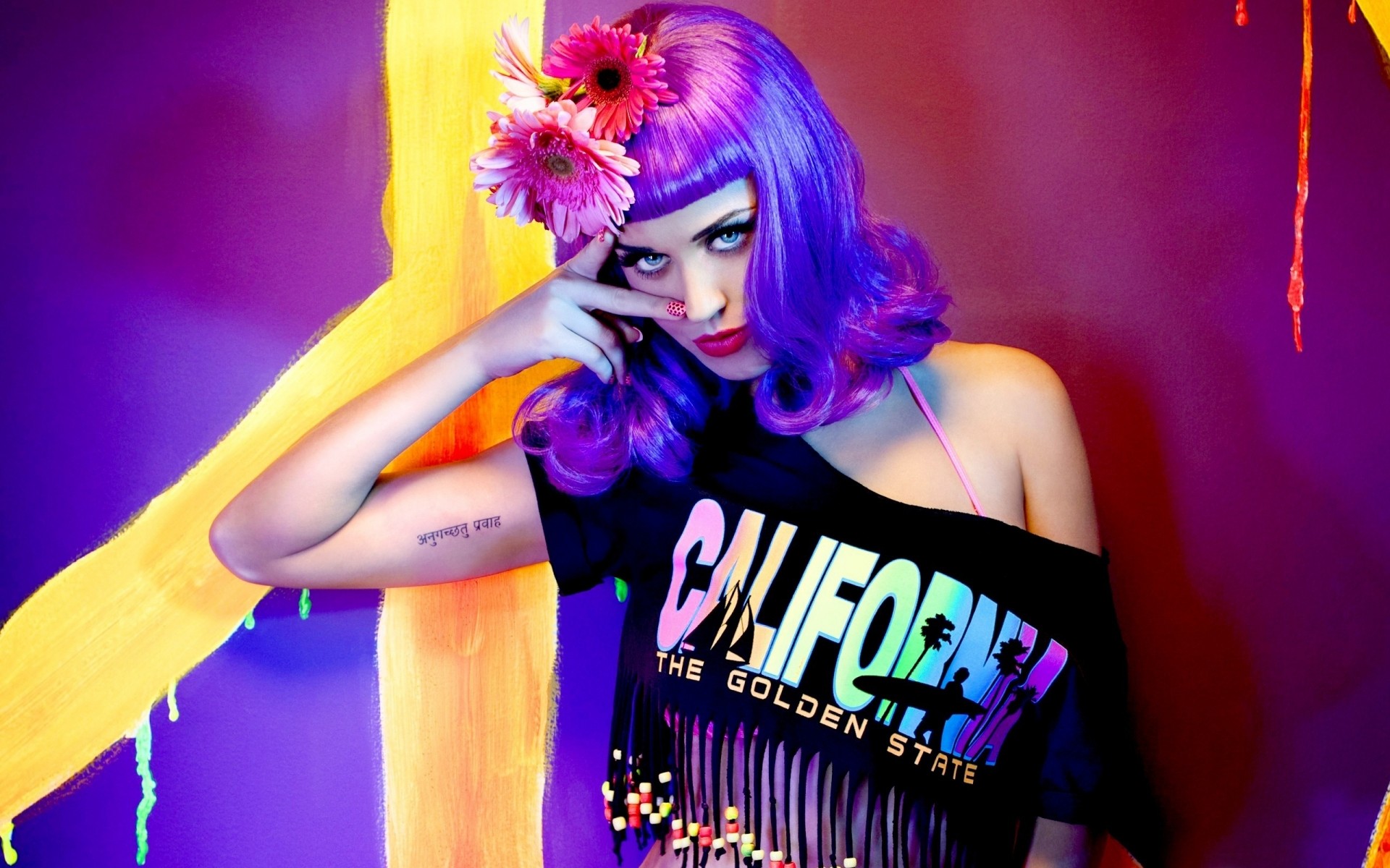 Ragazza con capelli viola e fiori nei capelli
