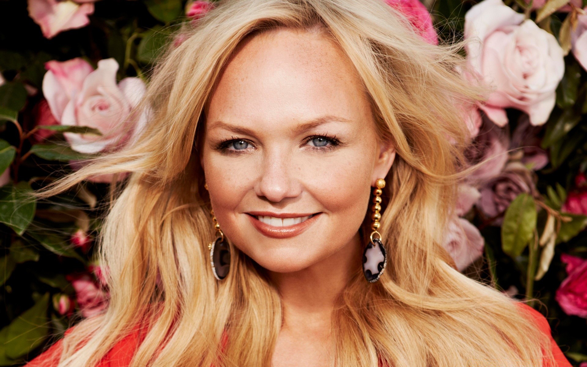 L'attrice sorride e guarda la telecamera. Bionda