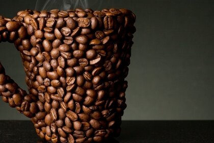 Tazza di caffè scuro con chicchi e in un cucchiaioTazza di caffè scuro con chicchi e in un cucchiaio