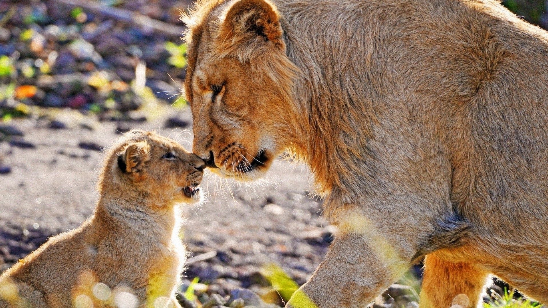 Piccolo cucciolo di leone si trova accanto a sua madre