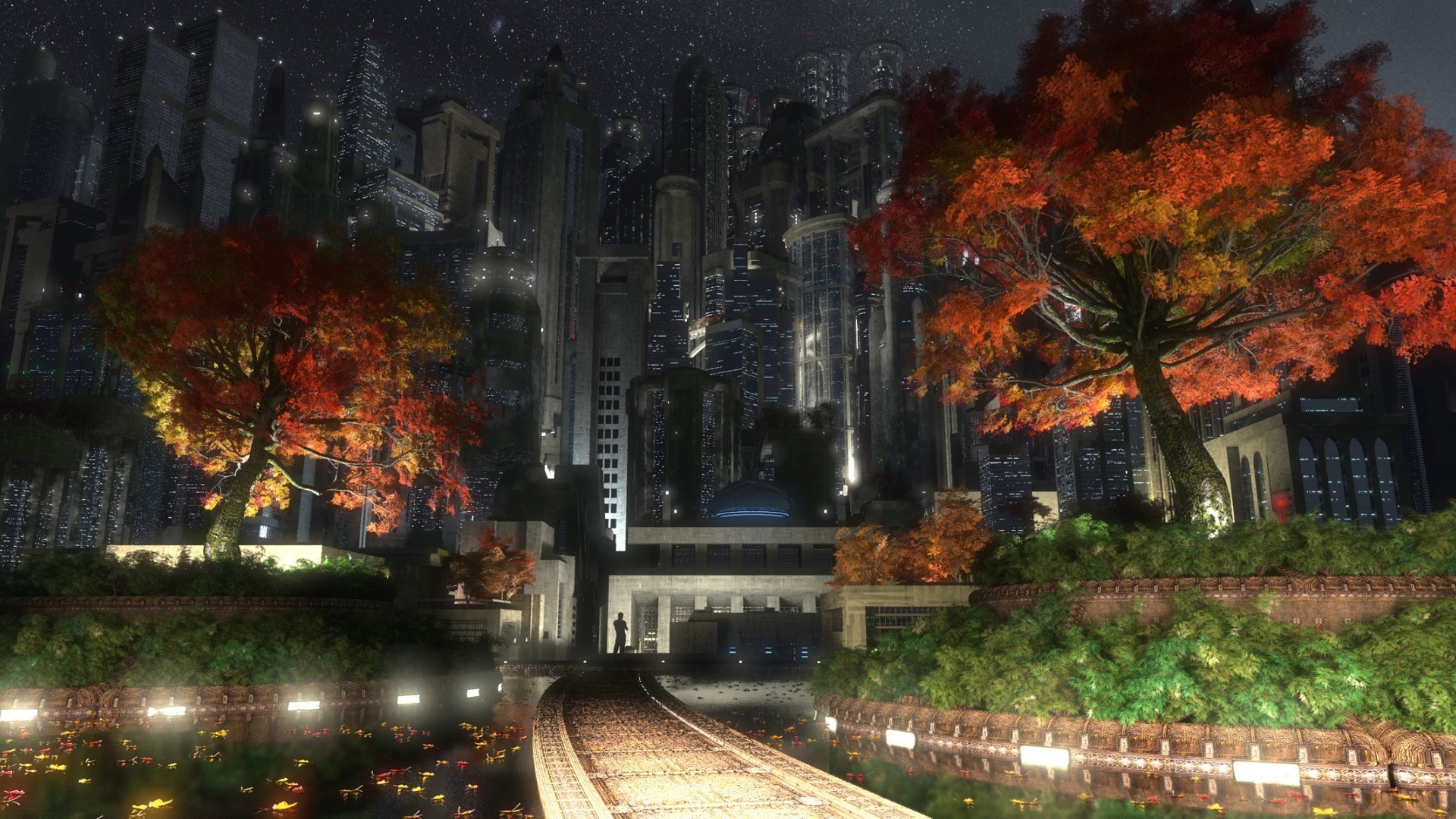 Autunno illuminato Parco sullo sfondo di grattacieli