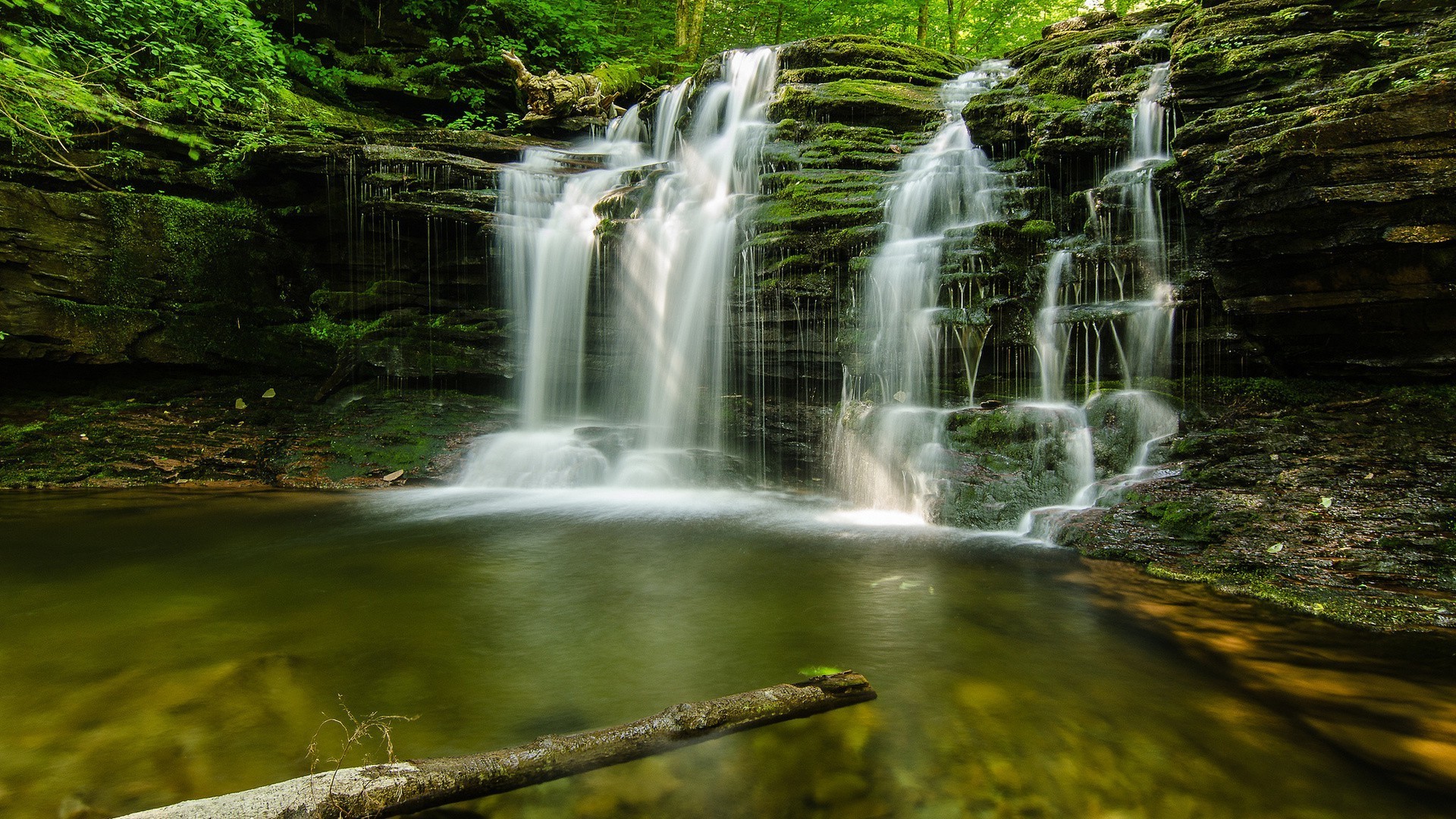 La cascata sfocia nel fiume sullo sfondo degli alberi autunnali
