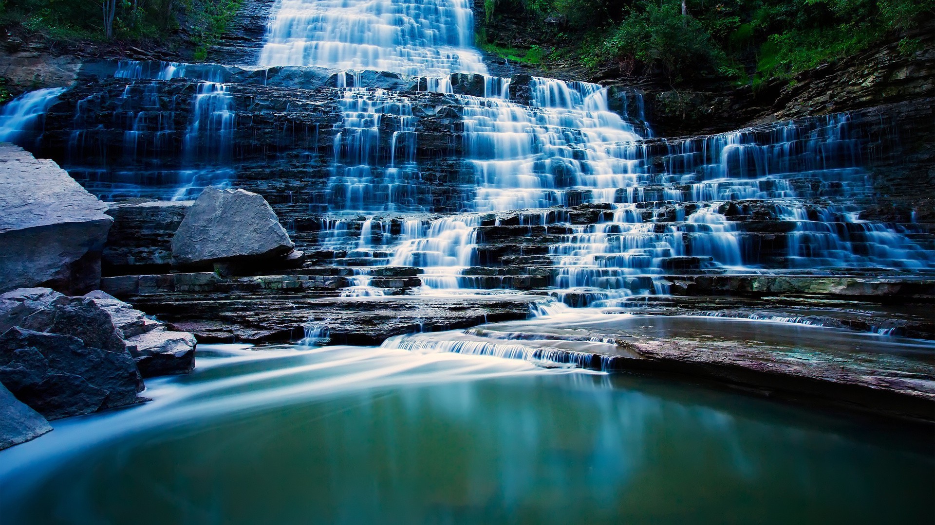 Cascata della foresta con pietre ricoperte di muschioCascata della foresta con pietre ricoperte di muschio
