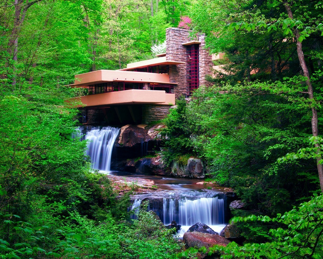 Una grande e potente cascata scende nel fiume attraverso un ponte