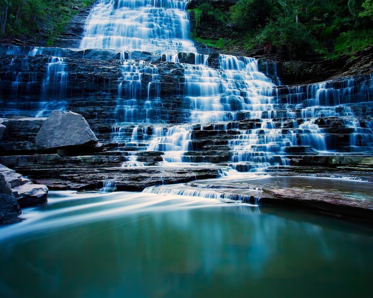 Bella cascata in mezzo a un lussureggiante legno getti le sue lie