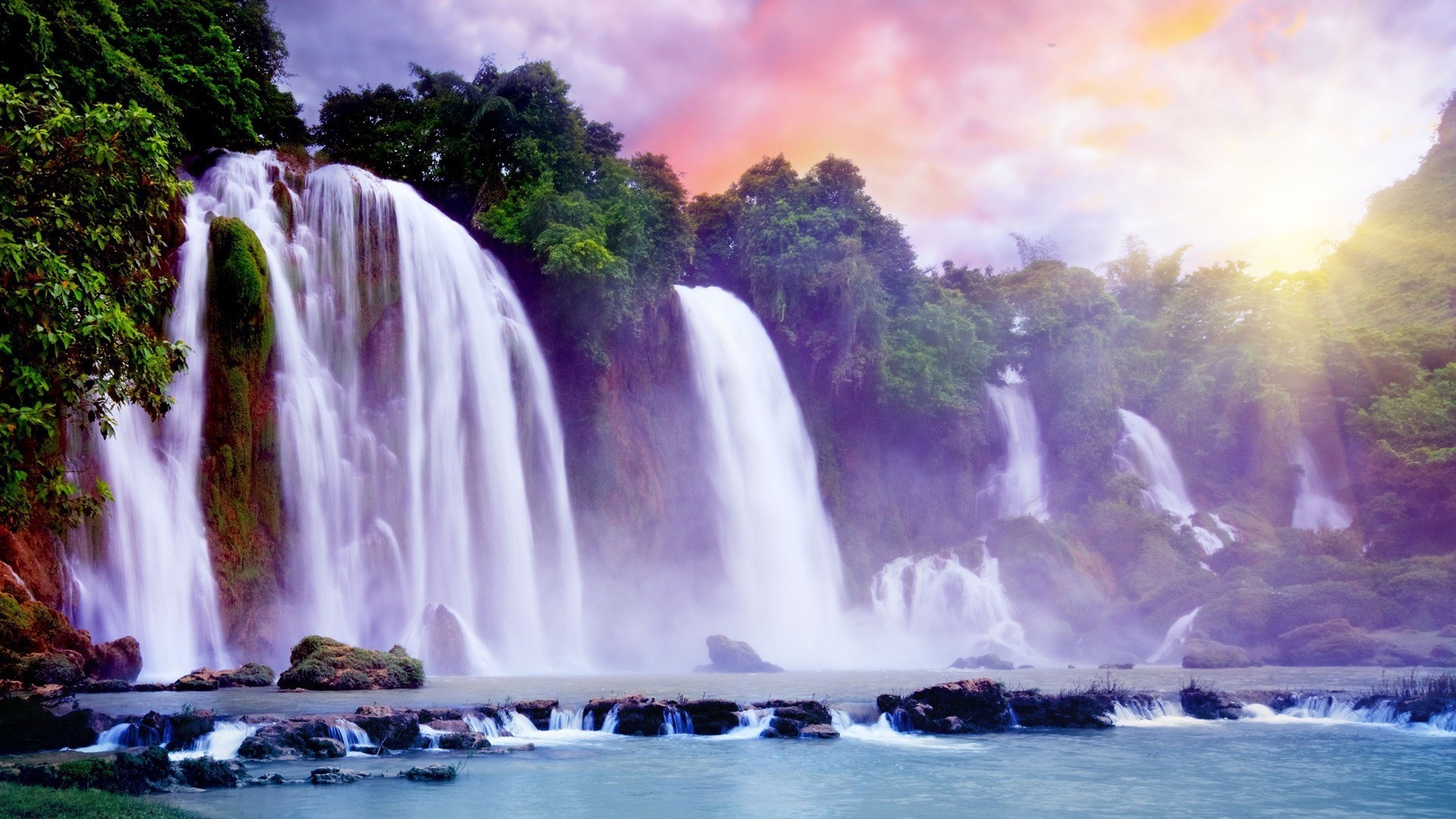 Cascata di montagna sullo sfondo della foresta e del soleCascata di montagna sullo sfondo della foresta e del sole