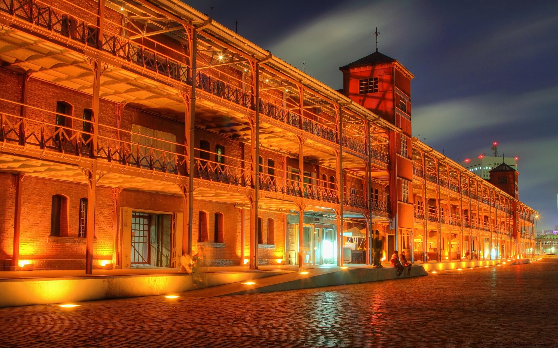 Riflesso nello stagno notturno di belle case europee antiche
