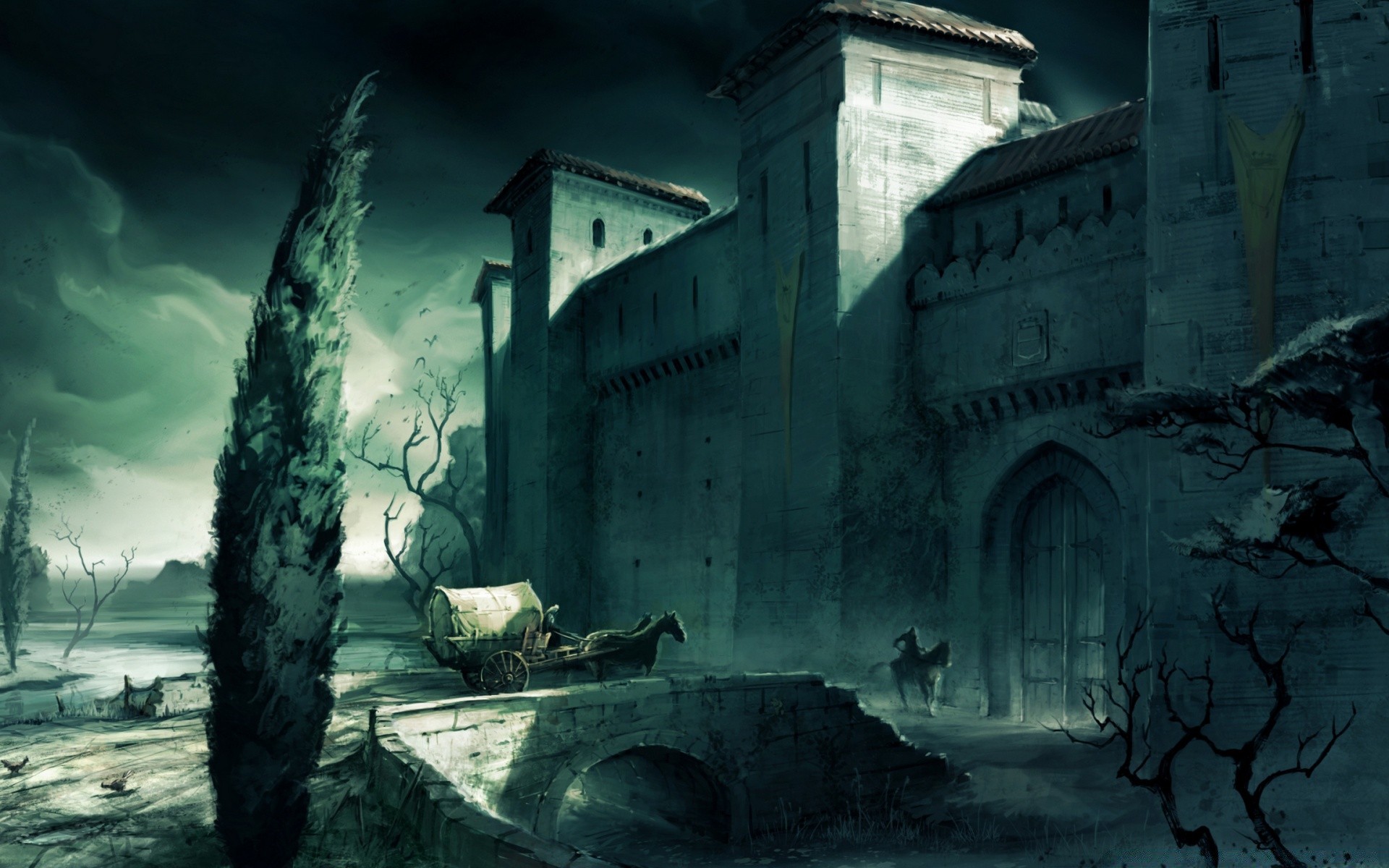 Castello sullo sfondo di montagne verdi e cielo bluCastello sullo sfondo di montagne verdi e cielo blu