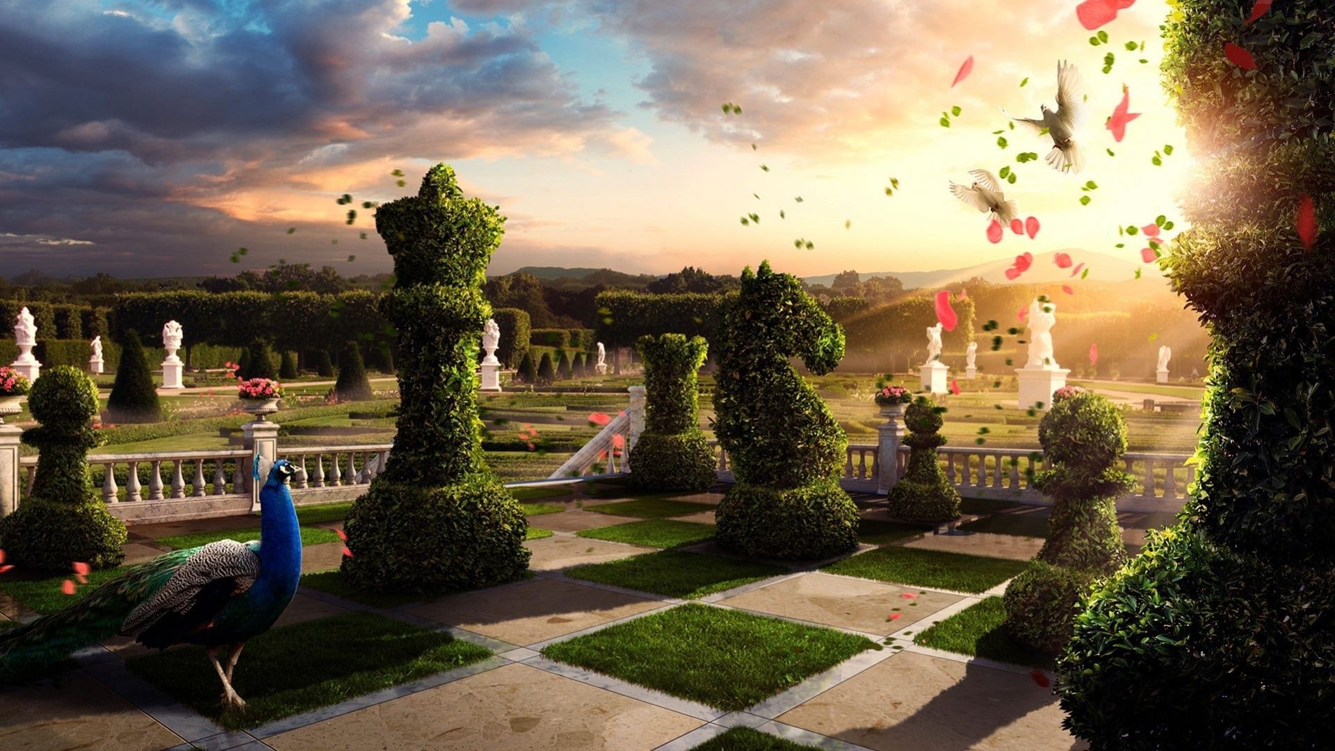Pezzi degli scacchi dai cespugli. Parco insolito