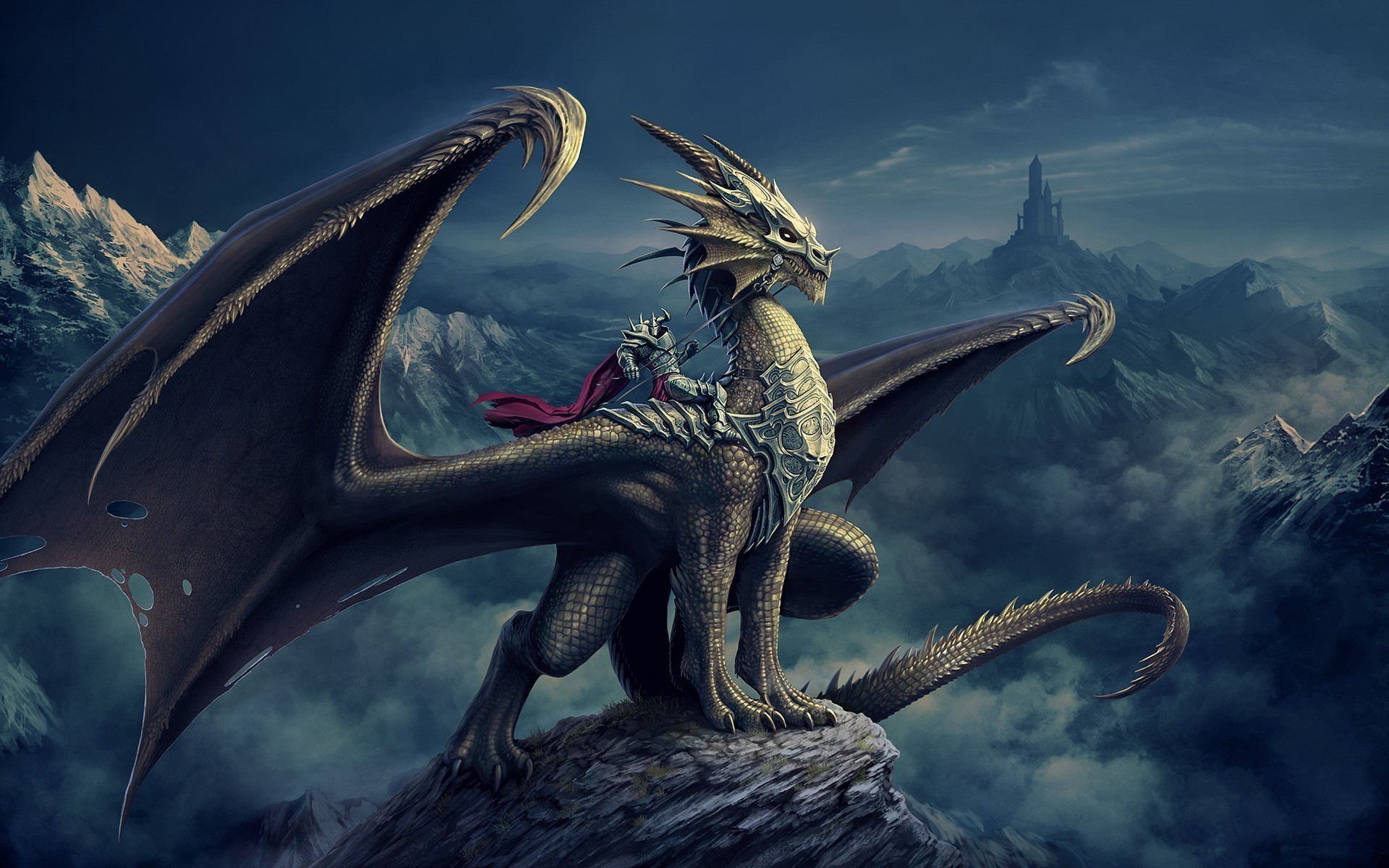 Cavaliere a cavallo di un enorme drago