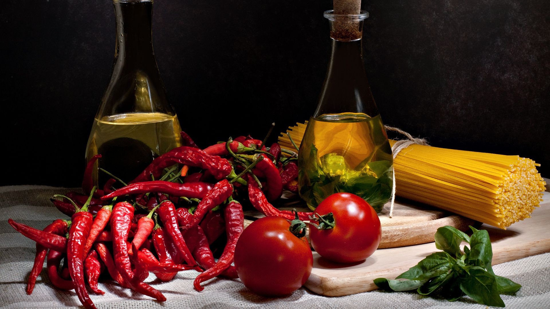 Set di buongustai. Pomodori, peperoncini e olio d'oliva