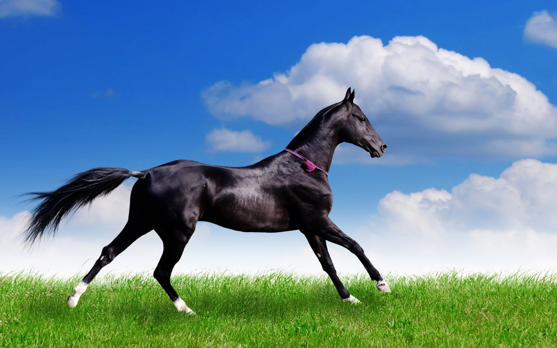 Cavallo con zoccoli bianchi. Bel cielo blu