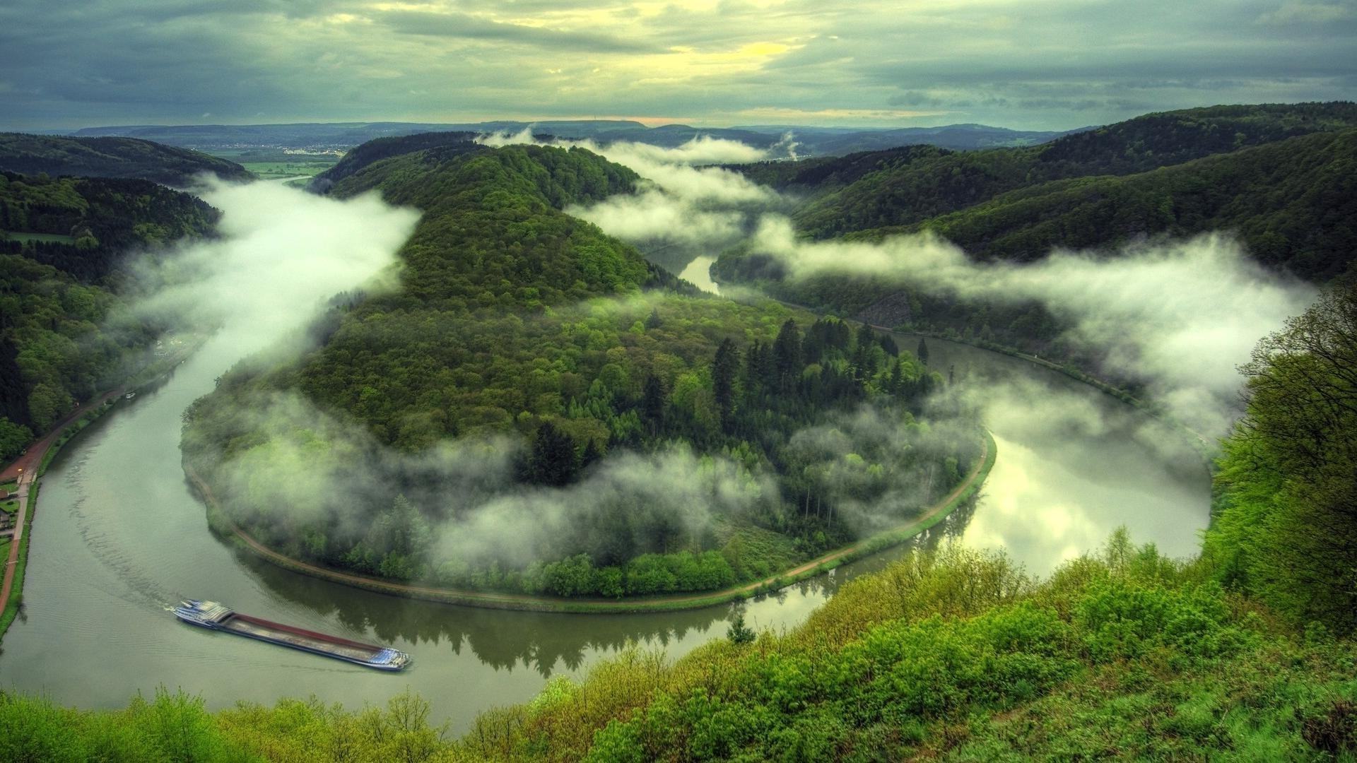 Chiatta che galleggia lungo un fiume tortuoso
