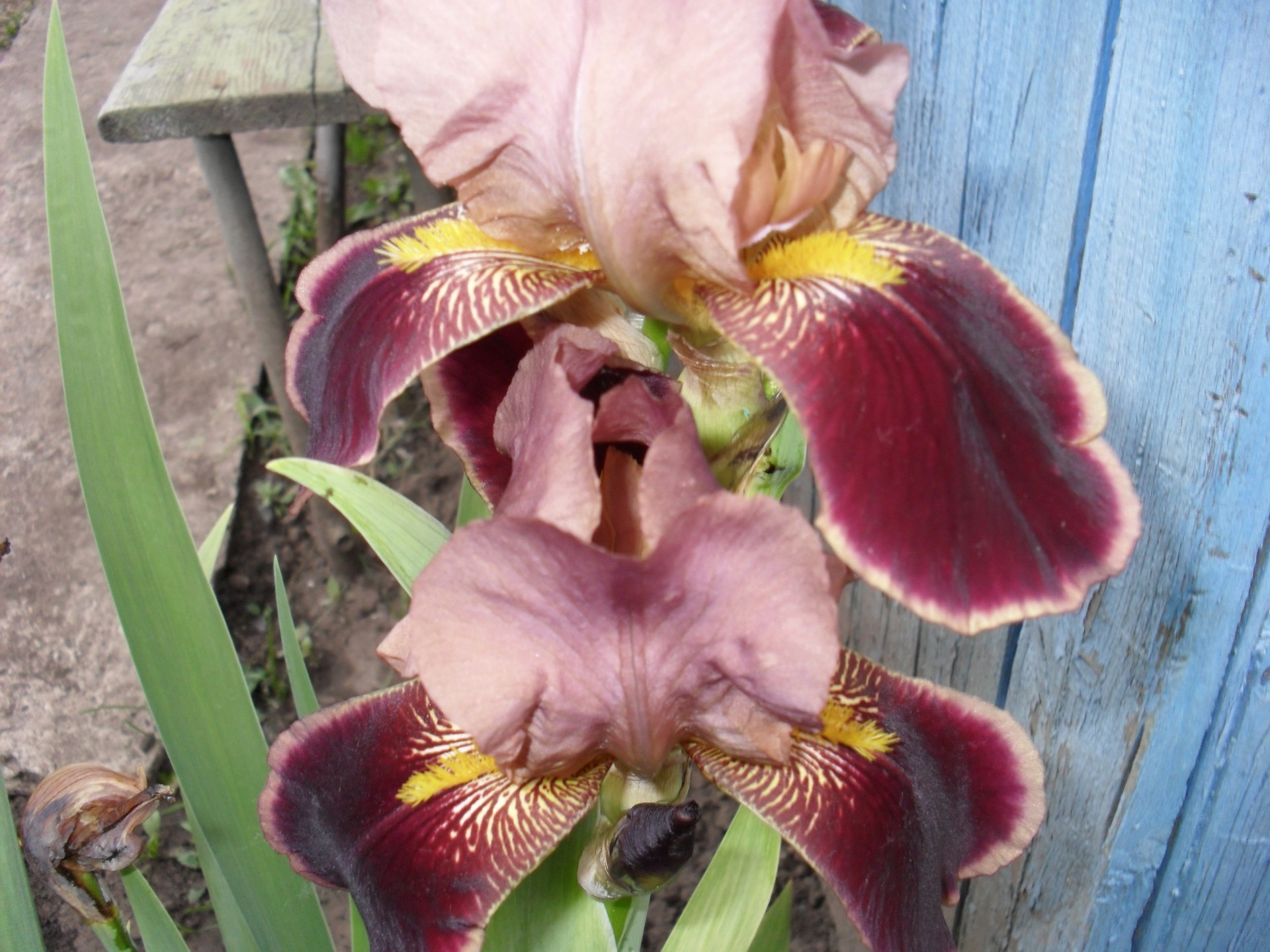 Iris in fiore di colore bardico sul letto vicino alla recinzione