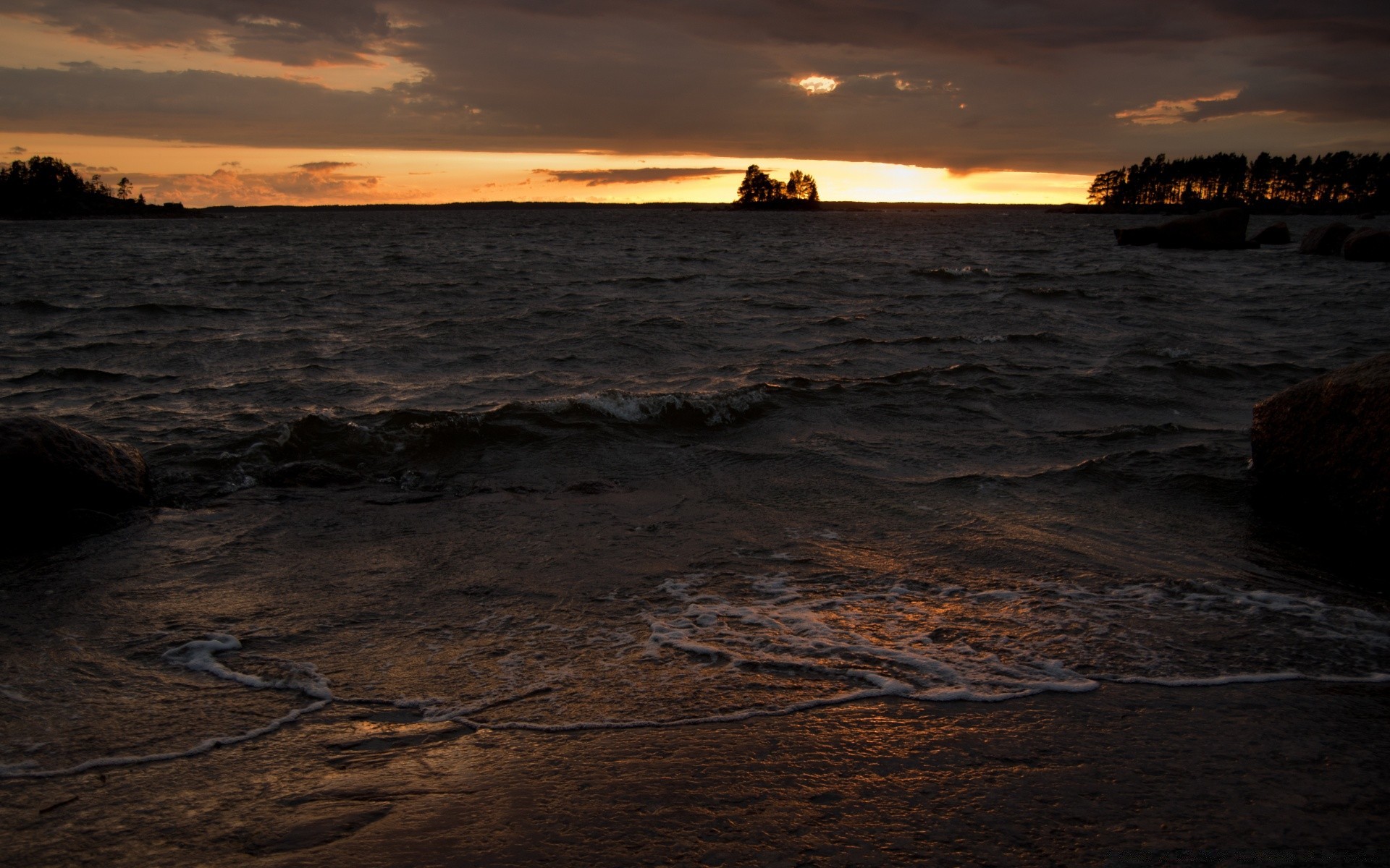 Piccole onde e schiuma vicino alla spiaggia al tramonto