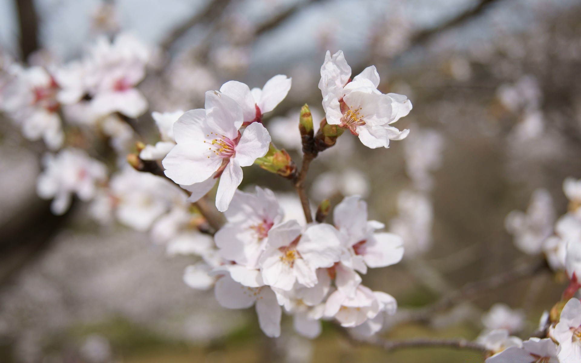Rami di ciliegio in fiore su uno sfondo di cielo blu