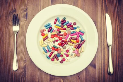 Compresse colorate hls su un coltello forchetta piattoCompresse colorate HLS su un coltello forchetta piatto