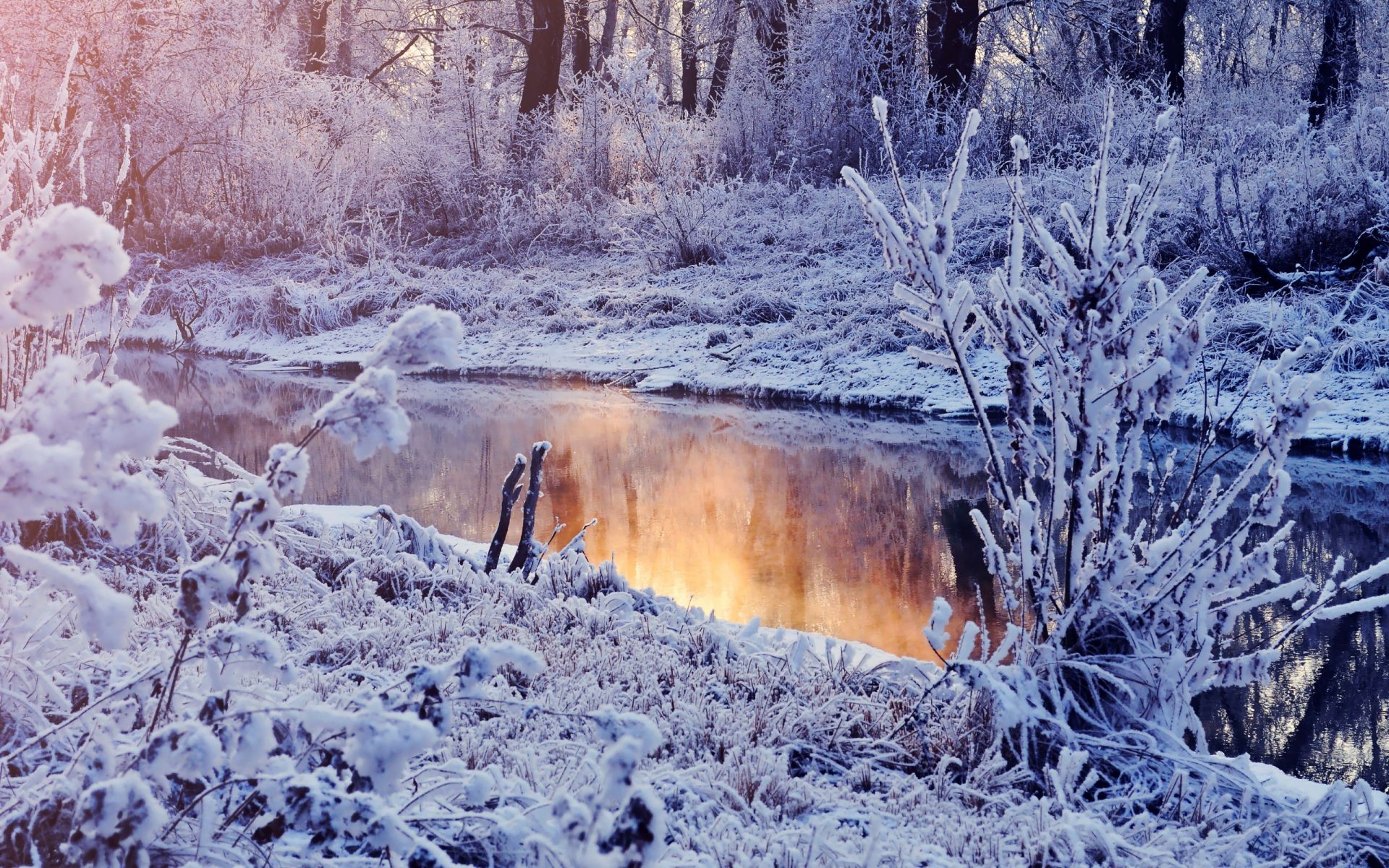 Tramonto gelido riflesso nell'acqua del fiume circondata dalle erbe e dagli alberi coperti di inia
