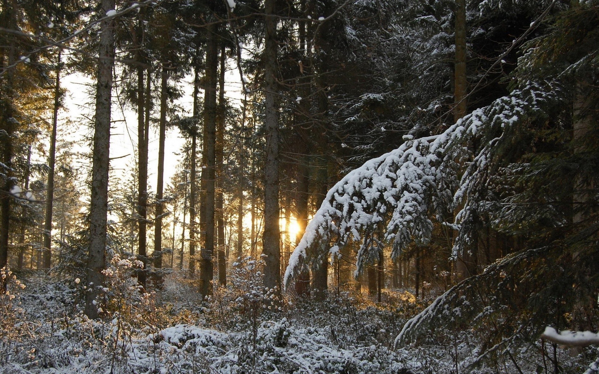 Alberi invernali cosparsi di neve che si chiudono verso l'alto