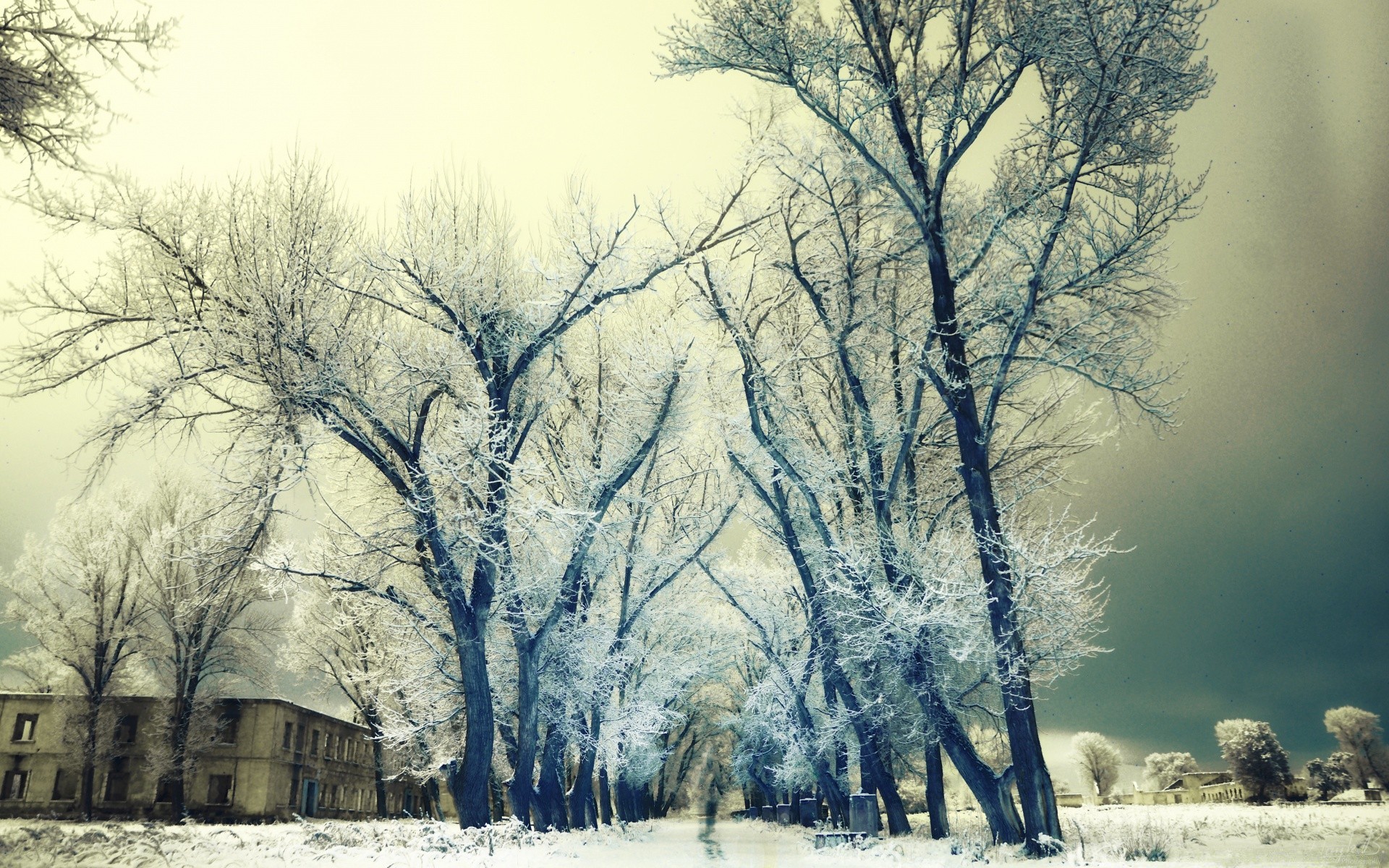 Gli abeti in montagna sono coperti di brina e stanno nella foschia