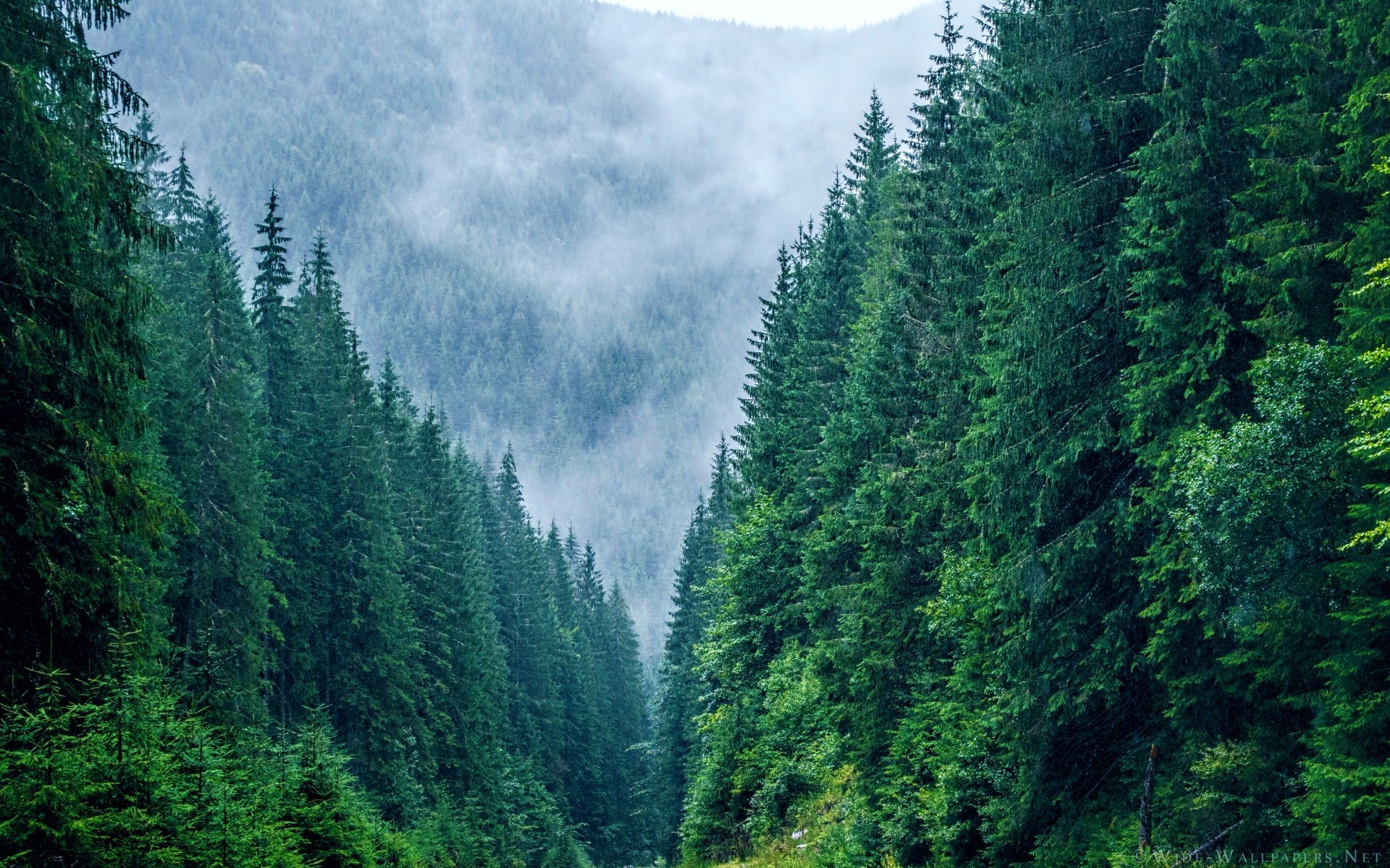 Paesaggio invernale, terreno montuoso e foresta di conifere