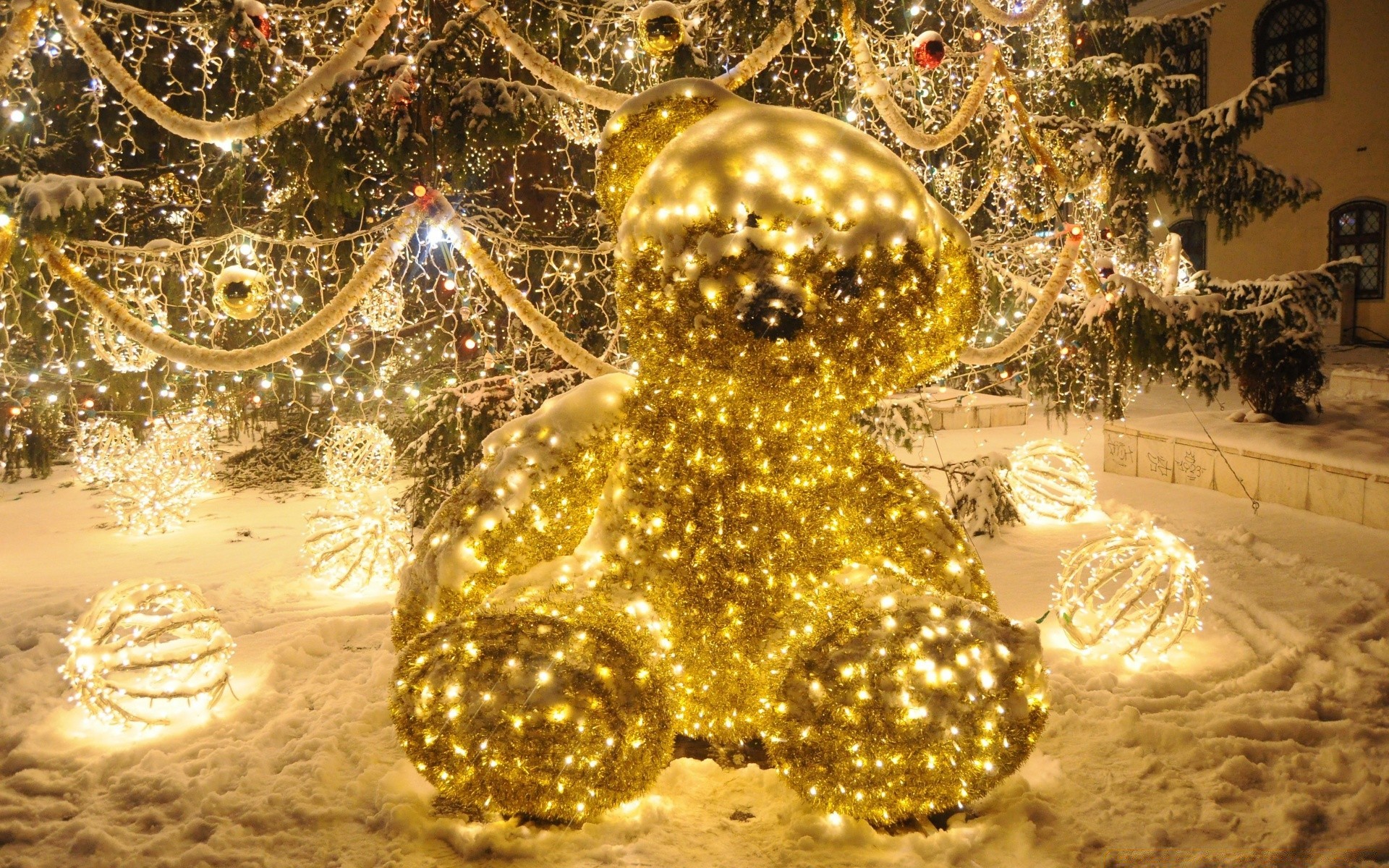 Coniglio grigio carino in cappelli di Natale su sfondo di giocattoli argentei e ghirlande
