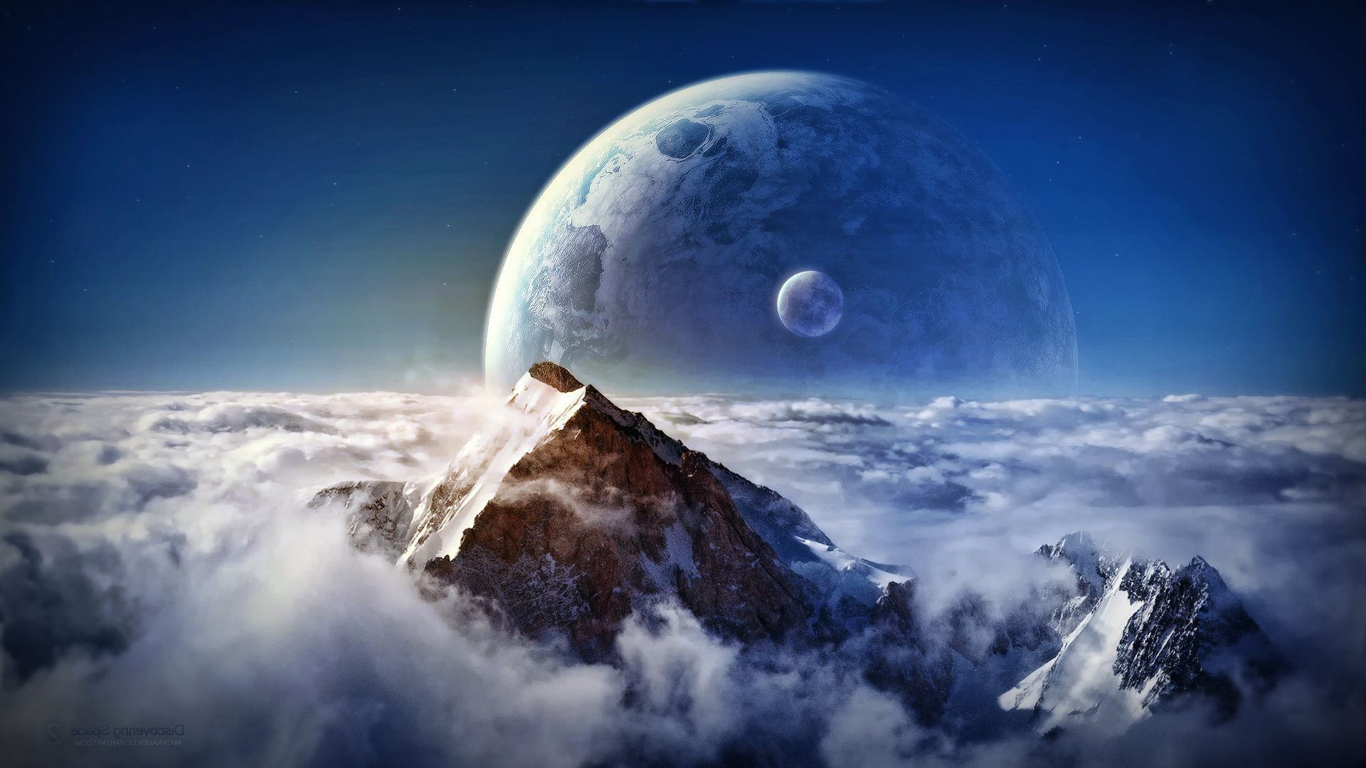 Cielo, montagna e Luna nel contorno del globo terrestre