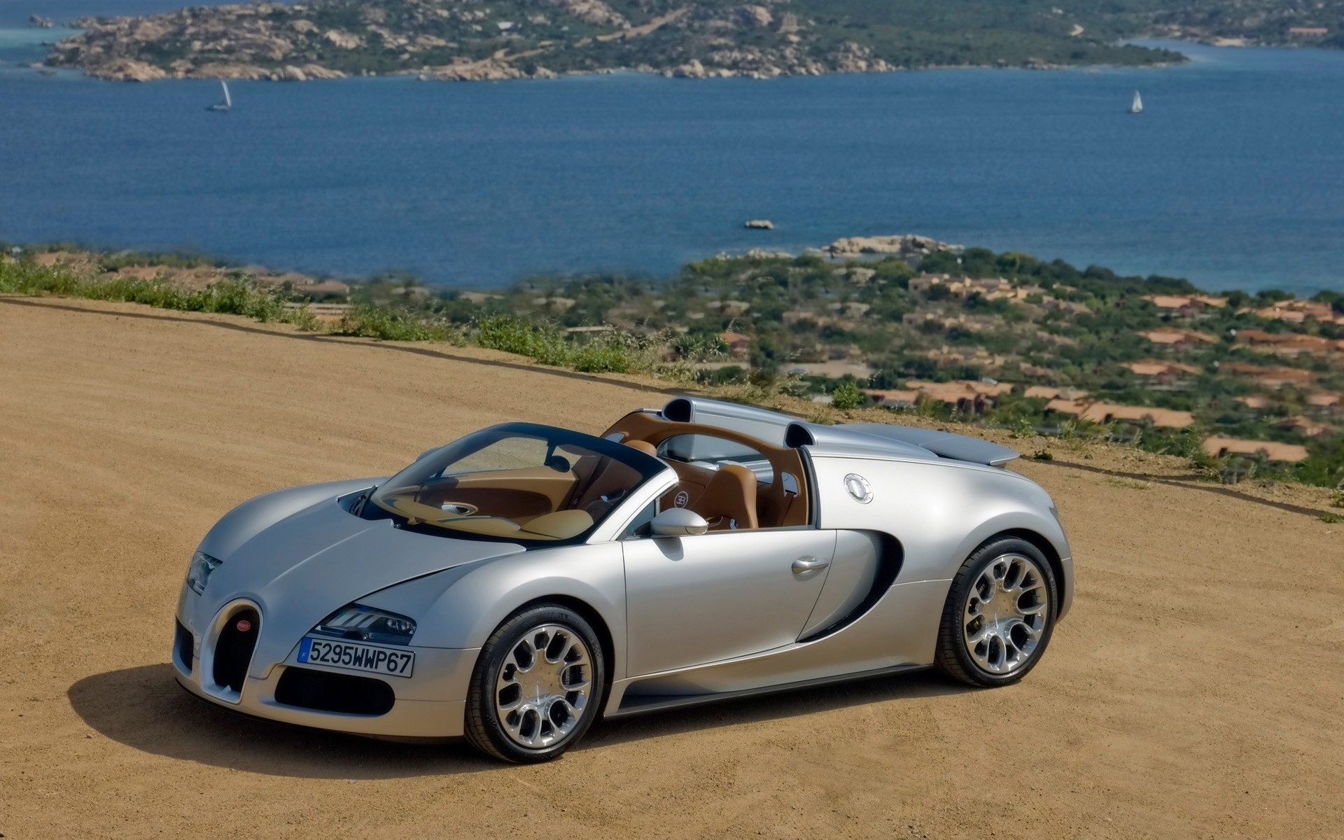Auto sportiva grigia bugatti sulla spiaggia vicino all'acqua