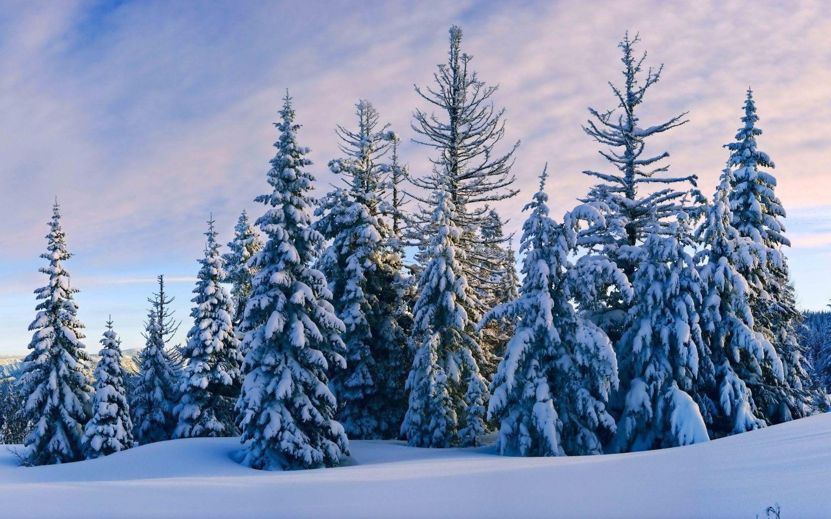 Paesaggio gelido con alberi di Natale tempestati di neve