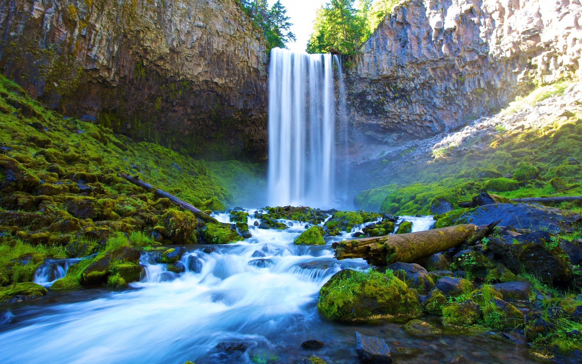 Una cascata lussureggiante scorre dalle montagne in un crepaccio e dirige il fiume verso l'oceano