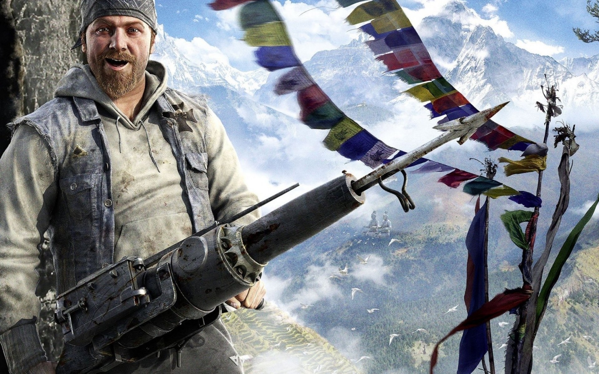 Eroe del gioco Farcry, armato, in piedi sullo sfondo di un paesaggio montano