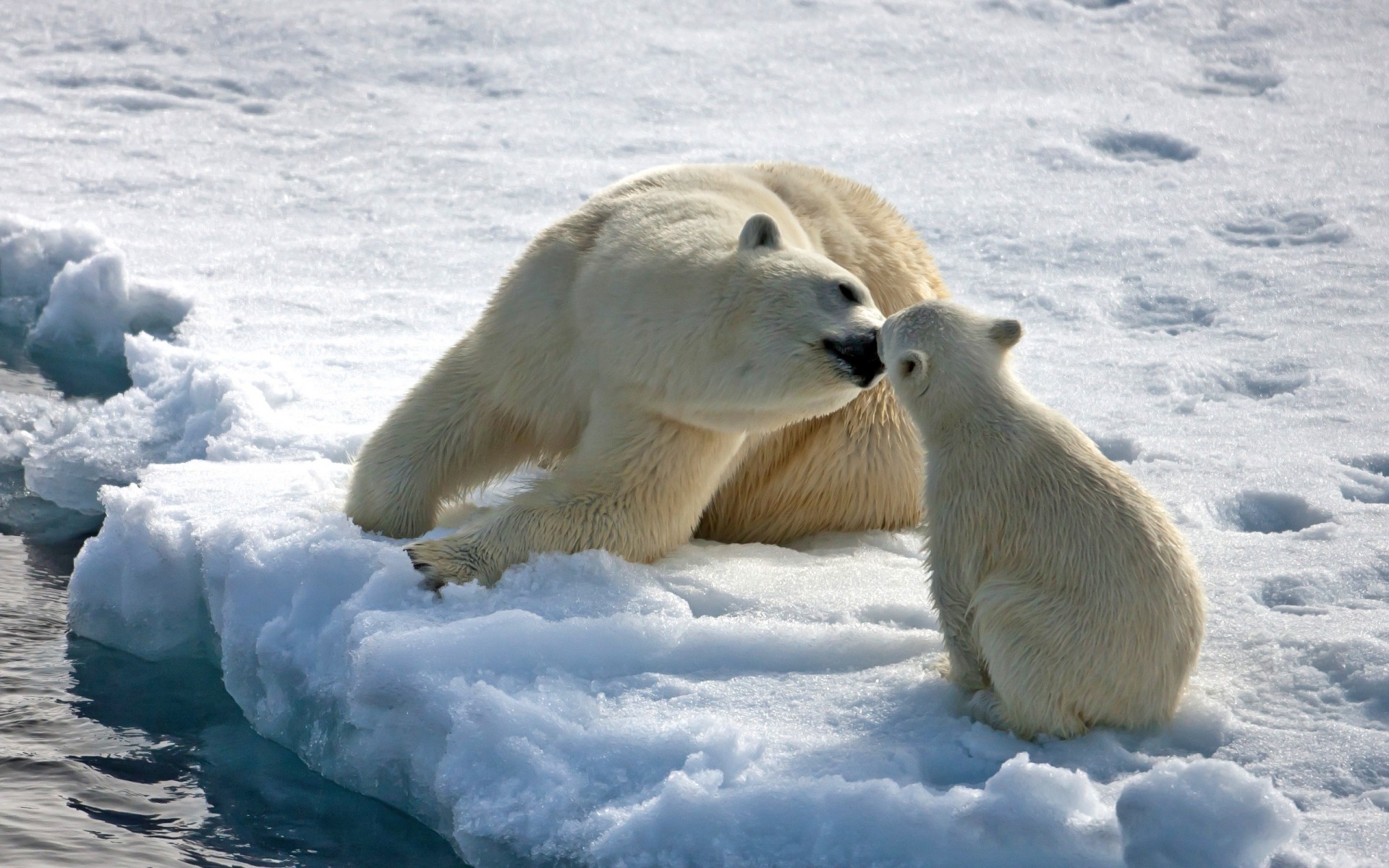 Orso con orso sul lastrone di ghiaccio in inverno