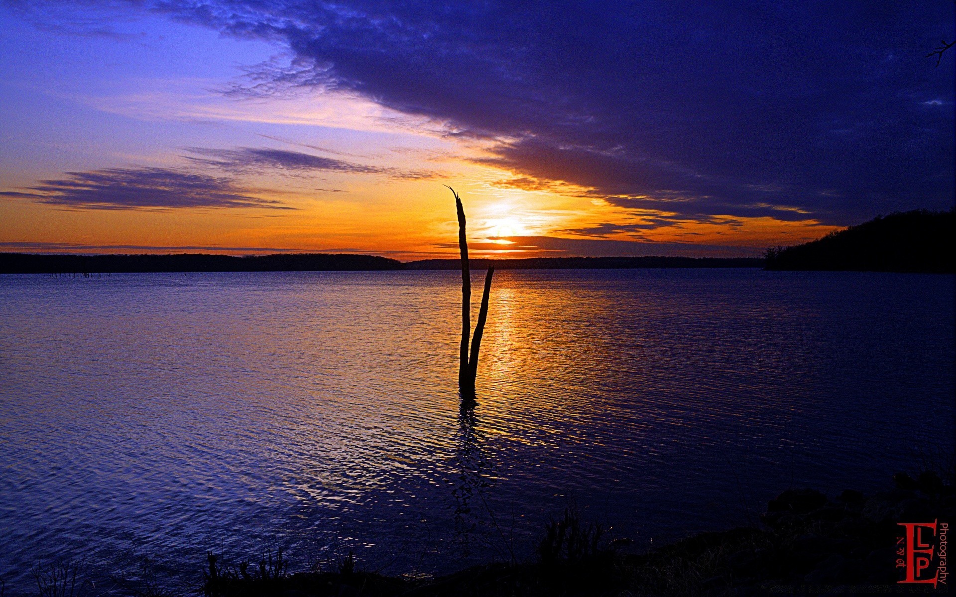 Tronco d'albero solitario che domina l'acqua del Lago sullo sfondo del tramonto