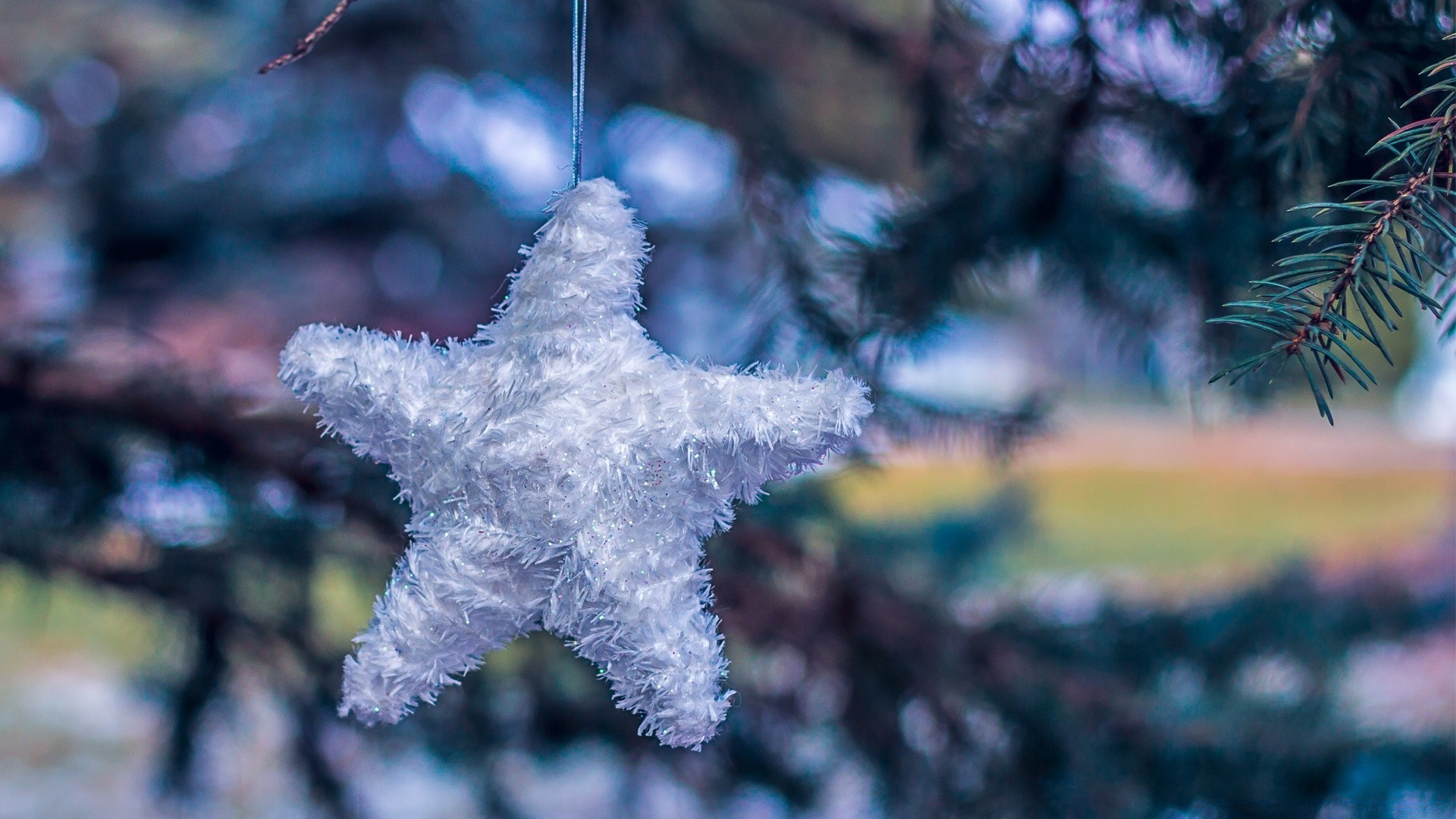 Stella soffice sull'albero di Natale. Decorazione natalizia