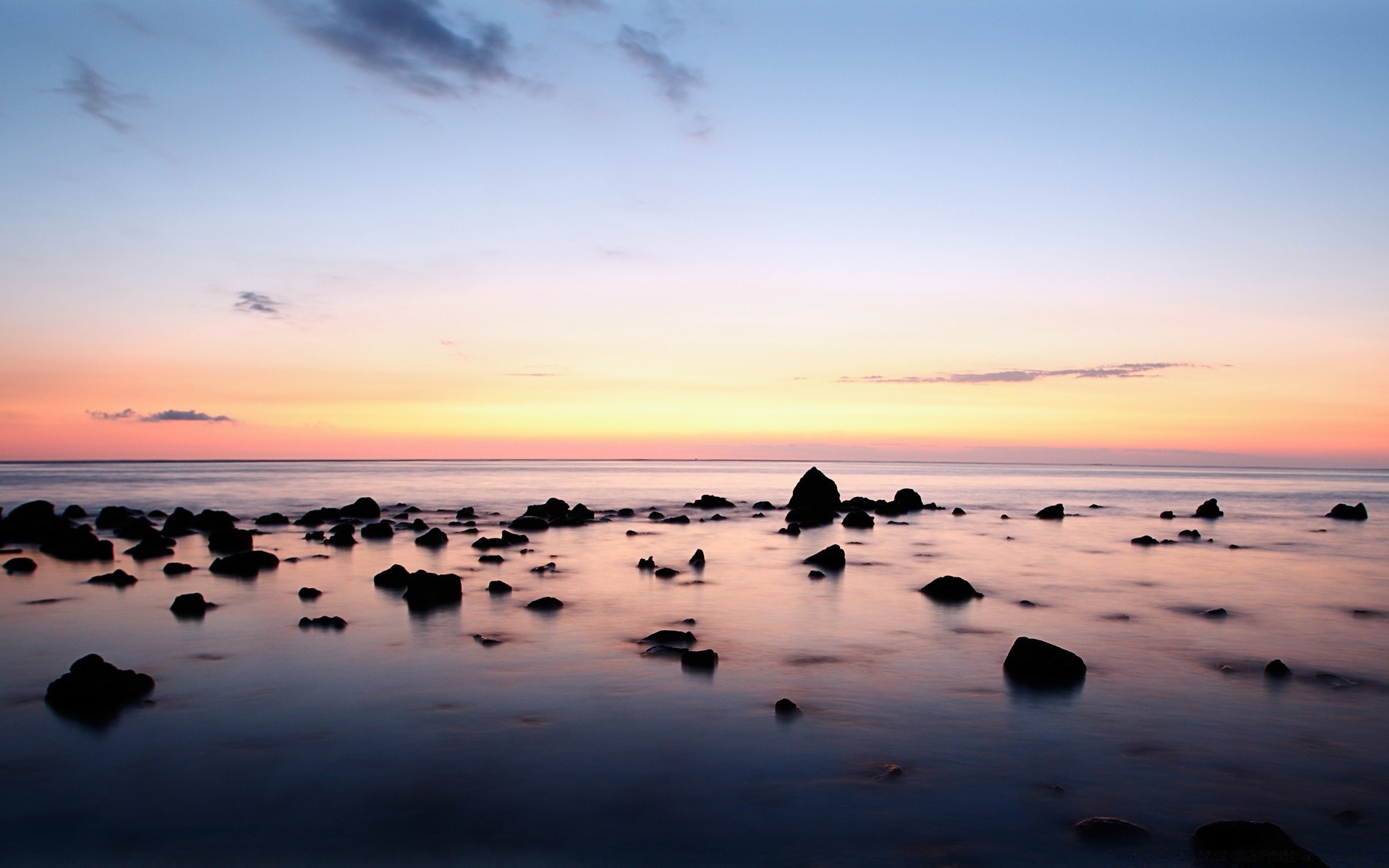 Grandi rocce sporgono dall'acqua di mare al tramontoGrandi rocce sporgono dall'acqua di mare al tramonto