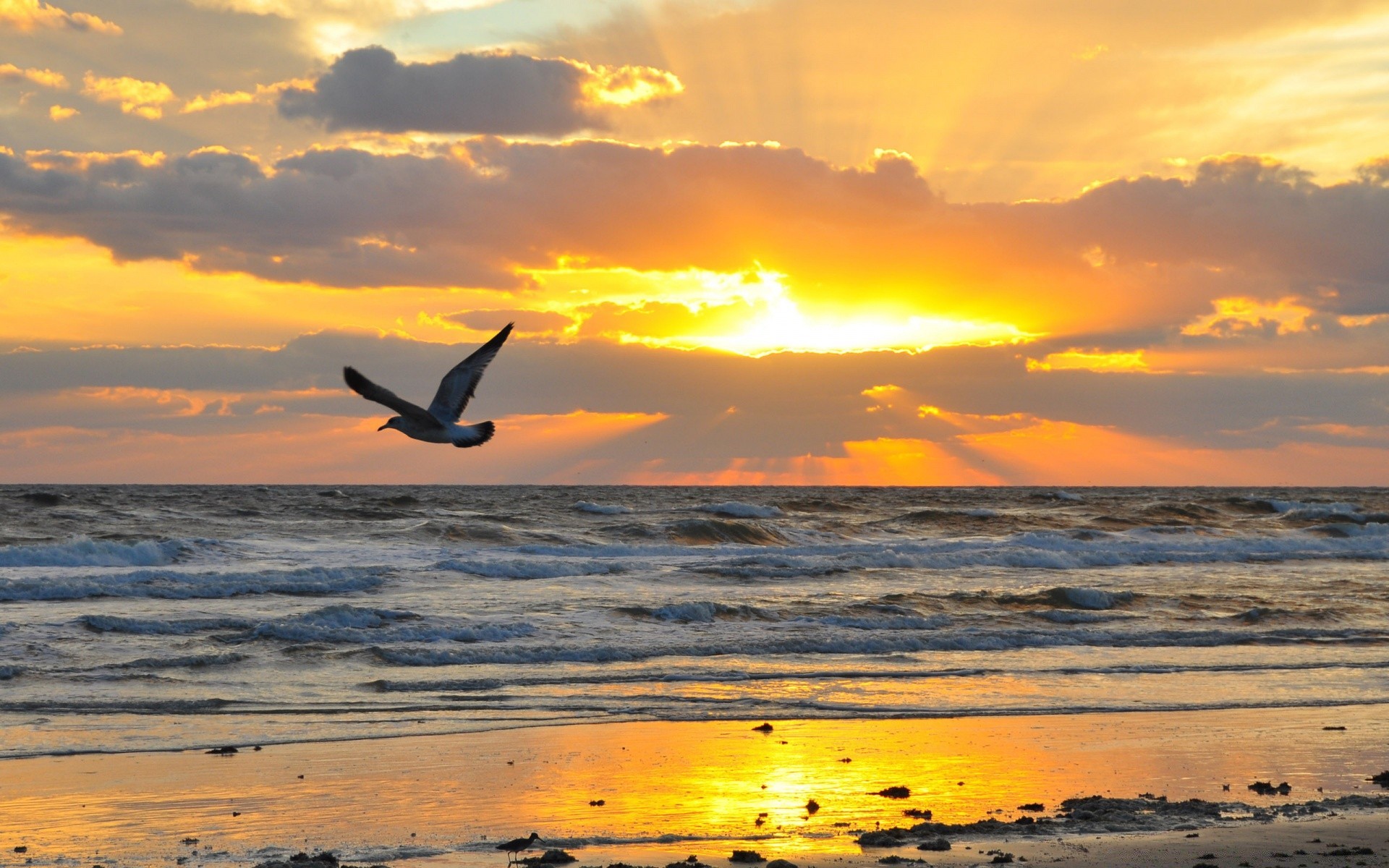 Uccello che vola sullo sfondo delle onde del mare e del tramonto