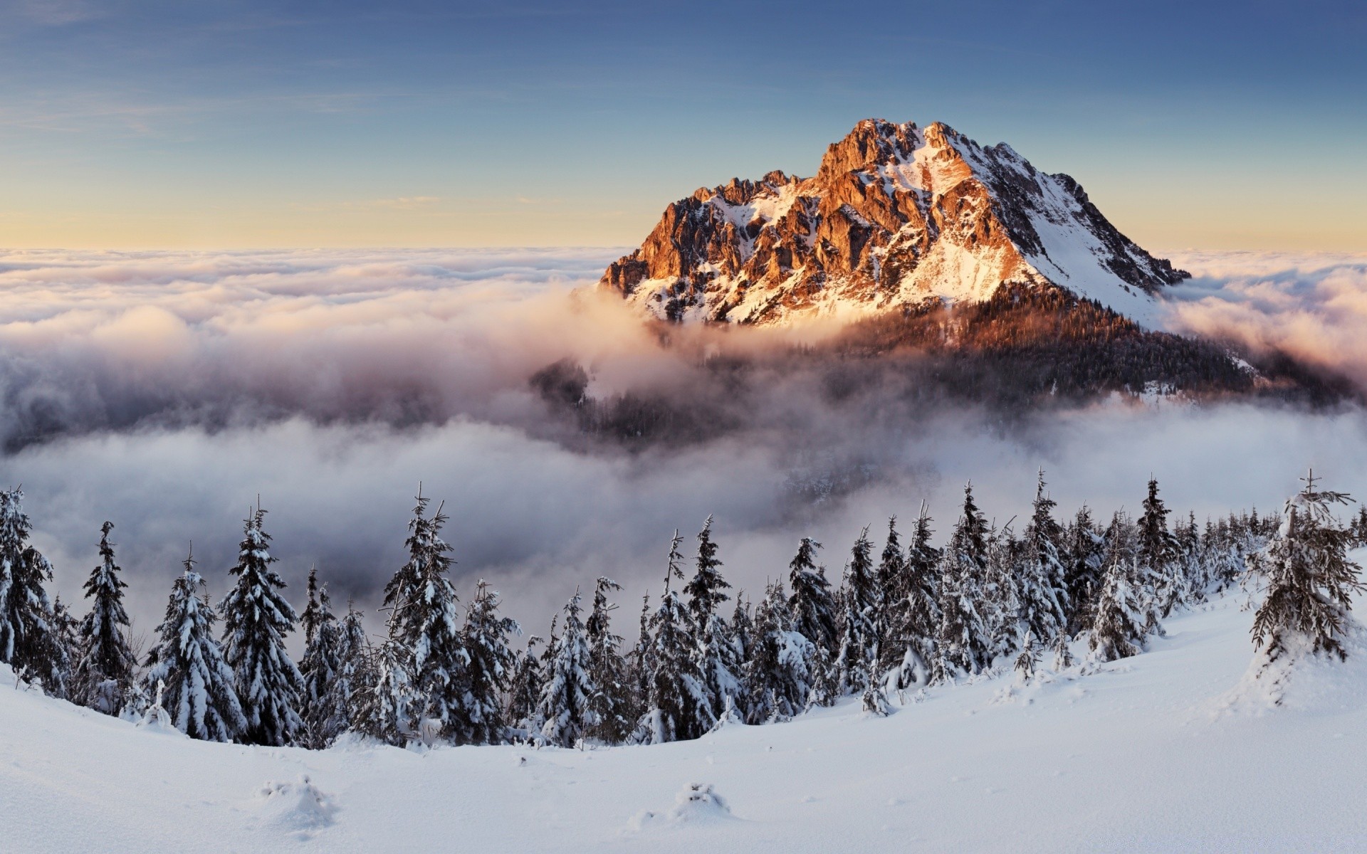 Alberi di Natale in fila. C'è nebbia. Montagna