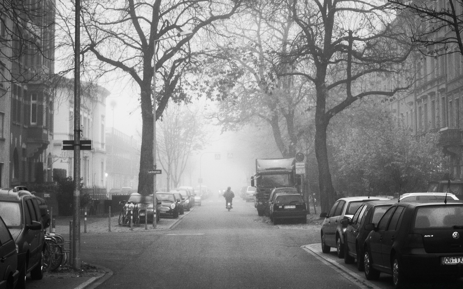 Un motociclista guida lungo la strada. ci sono macchine sul ciglio della strada