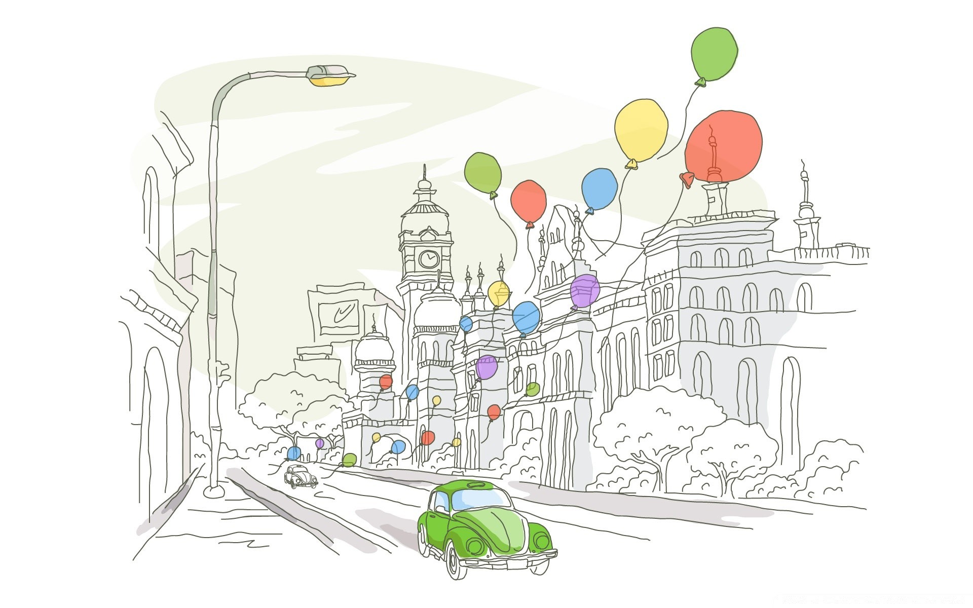 Disegno di auto verdi e palloncini sulla strada della cittàDisegno di auto verdi e palloncini sulla strada della città