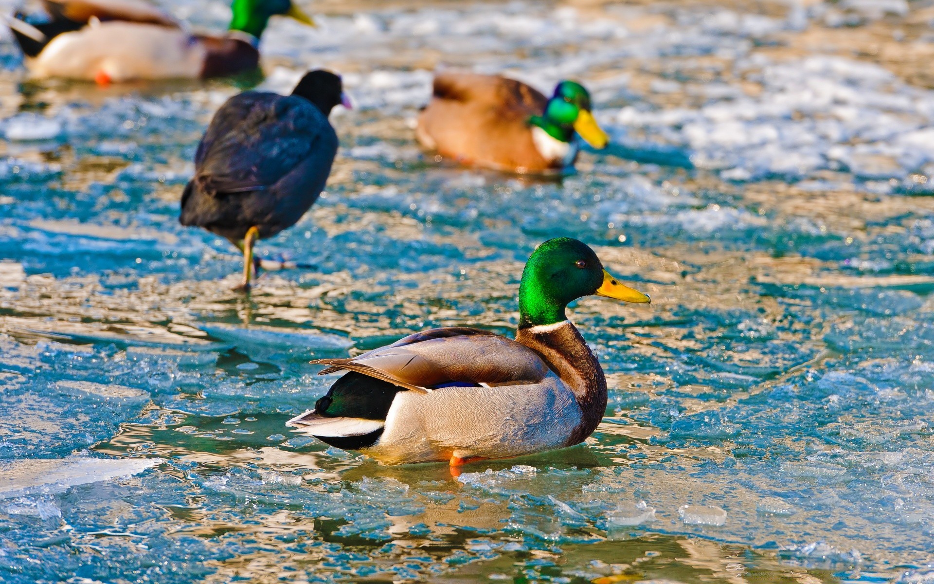 Le anatre nuotano sul lago e sono seguite da un cacciatore