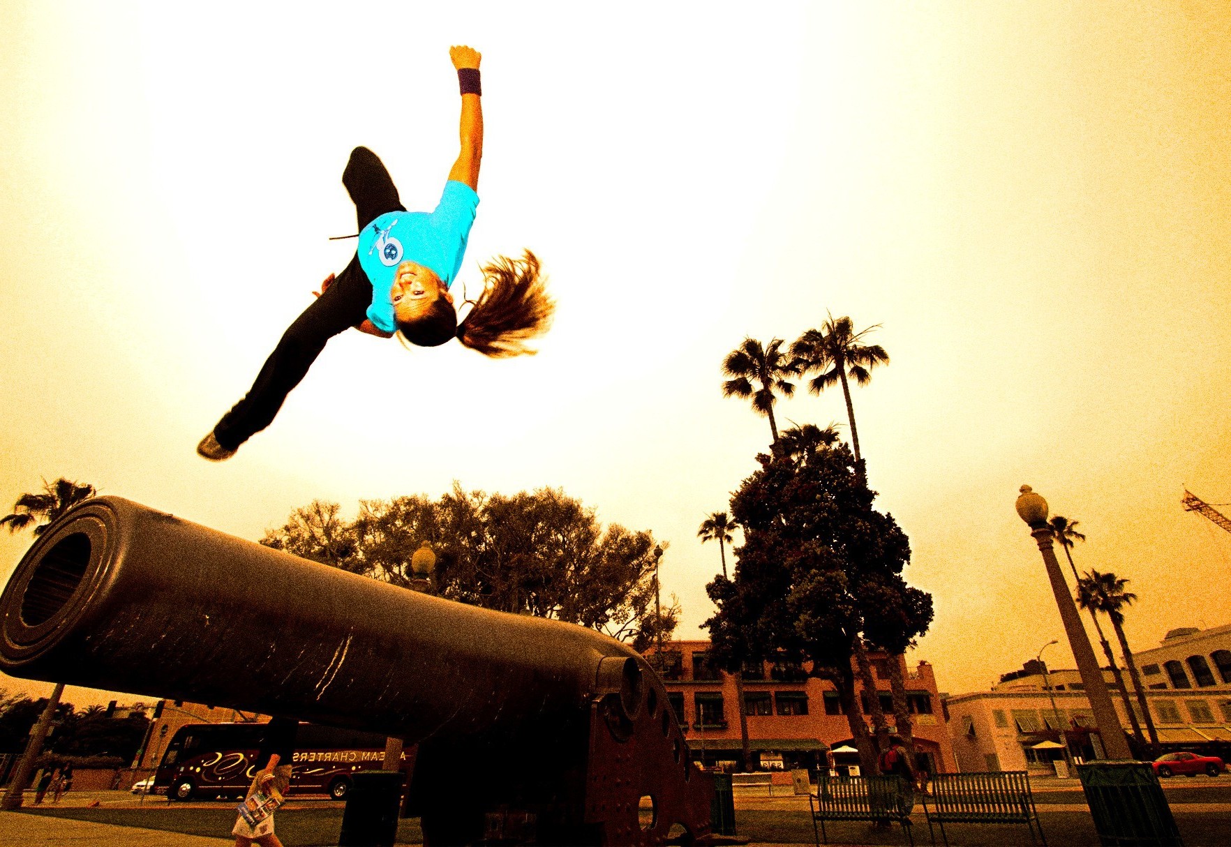 Parkour. La ragazza esegue una capriola laterale con un ostacolo